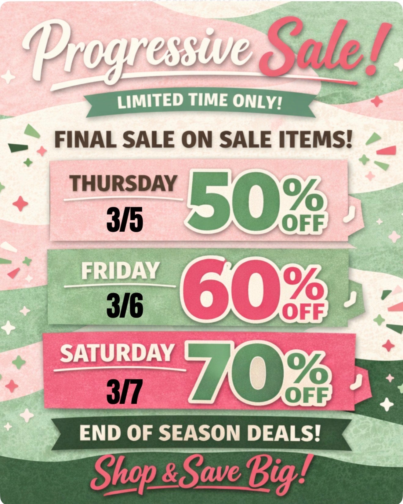 Our Progressive Sale starts now with 50% off select items. Then at Midnight on 3/5, we mark it down to 60% off! Then, yes, at midnight on 3/6, it goes down to 70% off! When we get to the end of every season, we have just a few pieces left in every collection. As much as we love them, we want them to find a place to be seen! Shop now for best selection.