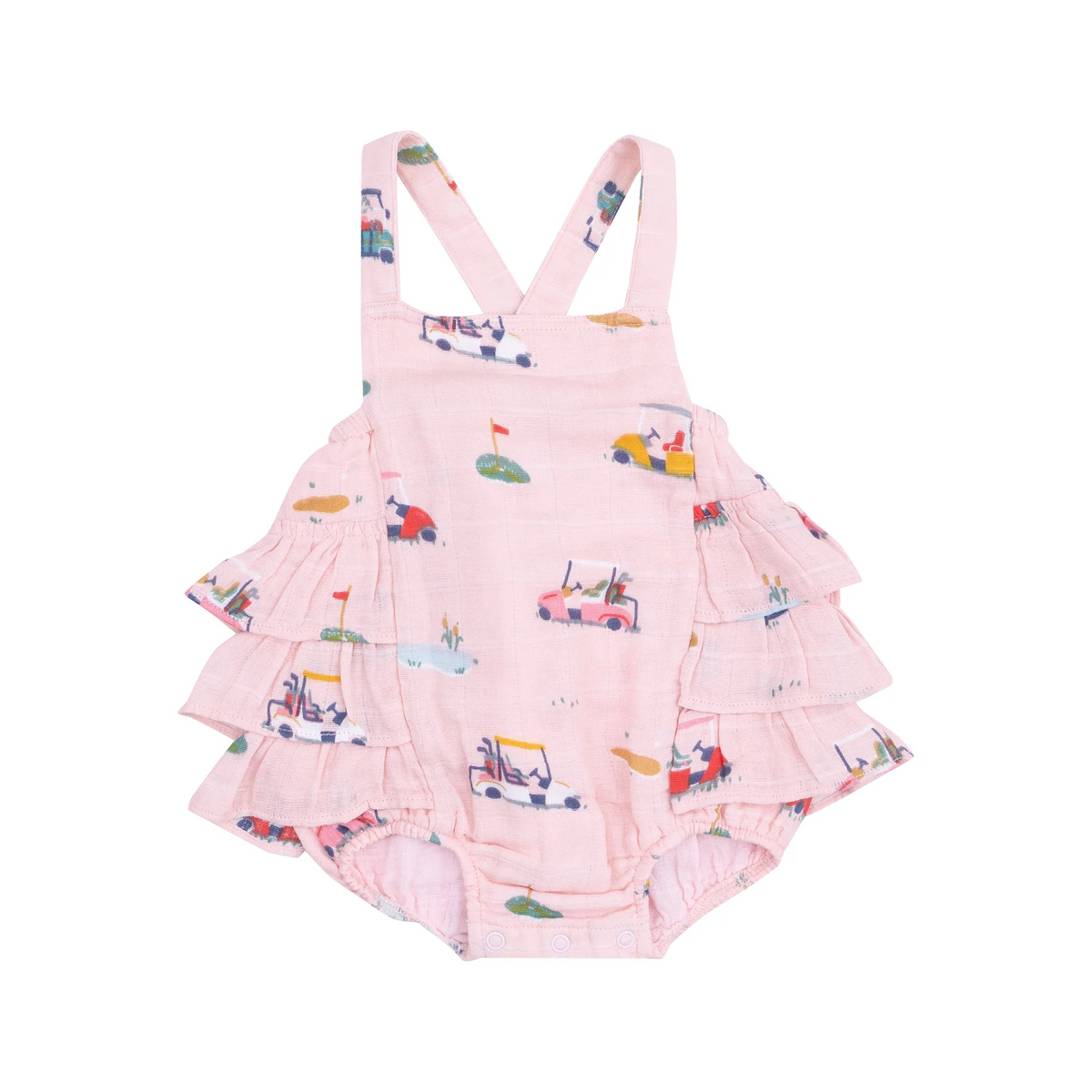 Soft, breathable pink ruffle sunsuit perfect for sunny adventures! Features organic cotton muslin fabric, snap crotch for easy diaper changes, and adjustable straps for the perfect fit. Keeps your little one cool and adorable whether at the beach, park, or backyard playtime. Machine washable on cold.