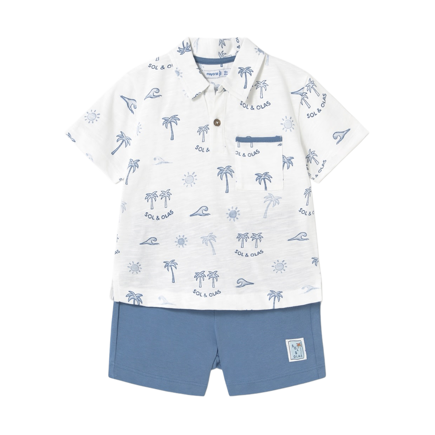 Dress your little one in style with our adorable baby boy's shirt and shorts set, perfect for sunny days! The white polo features a charming blue beach-inspired doodle print, showcasing palm trees, ocean waves, and a shining sun, all while proudly declaring "sol & olas." With a two-button design and a front pocket accented with blue trim, this shirt is both fashionable and functional. The coordinating blue shorts are designed for comfort, featuring an elastic waistband with an adjustable drawstring and a small square patch that echoes the shirt's delightful message. Crafted from super soft cotton, this set ensures your baby stays cool and comfy while looking effortlessly cute!