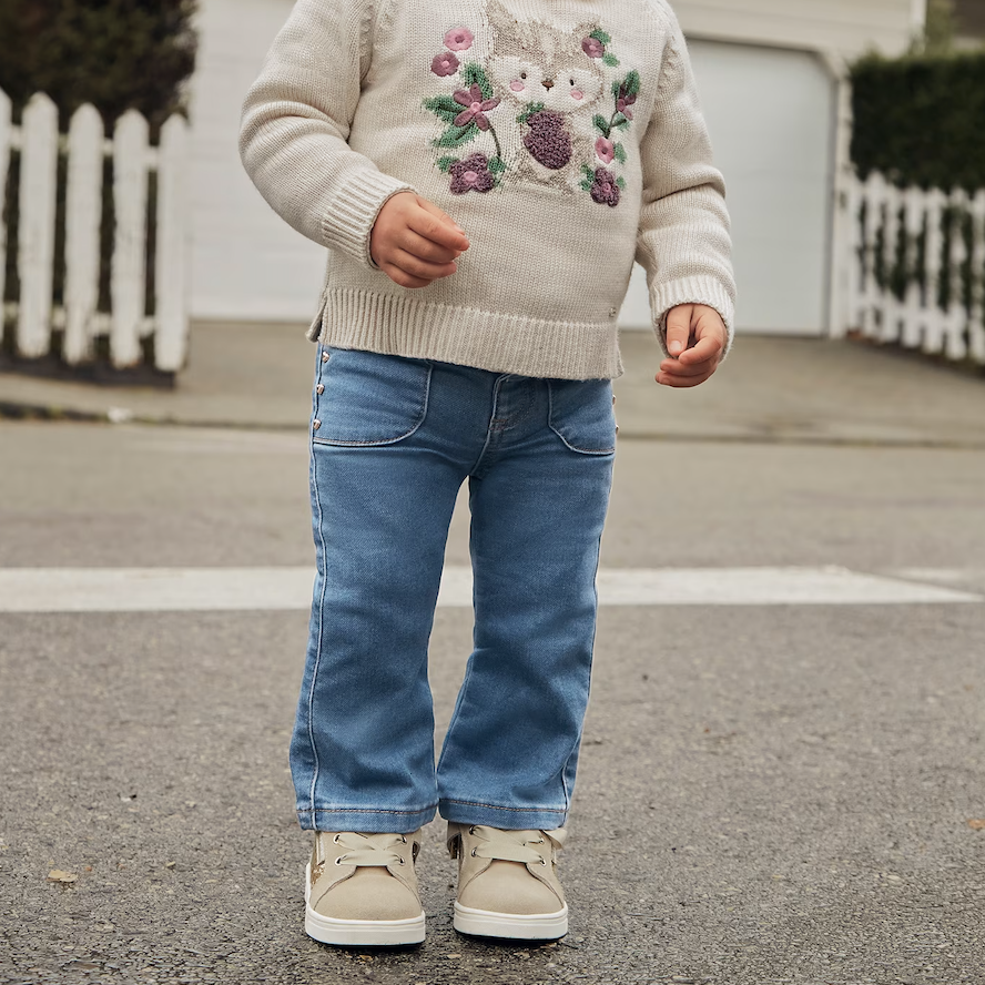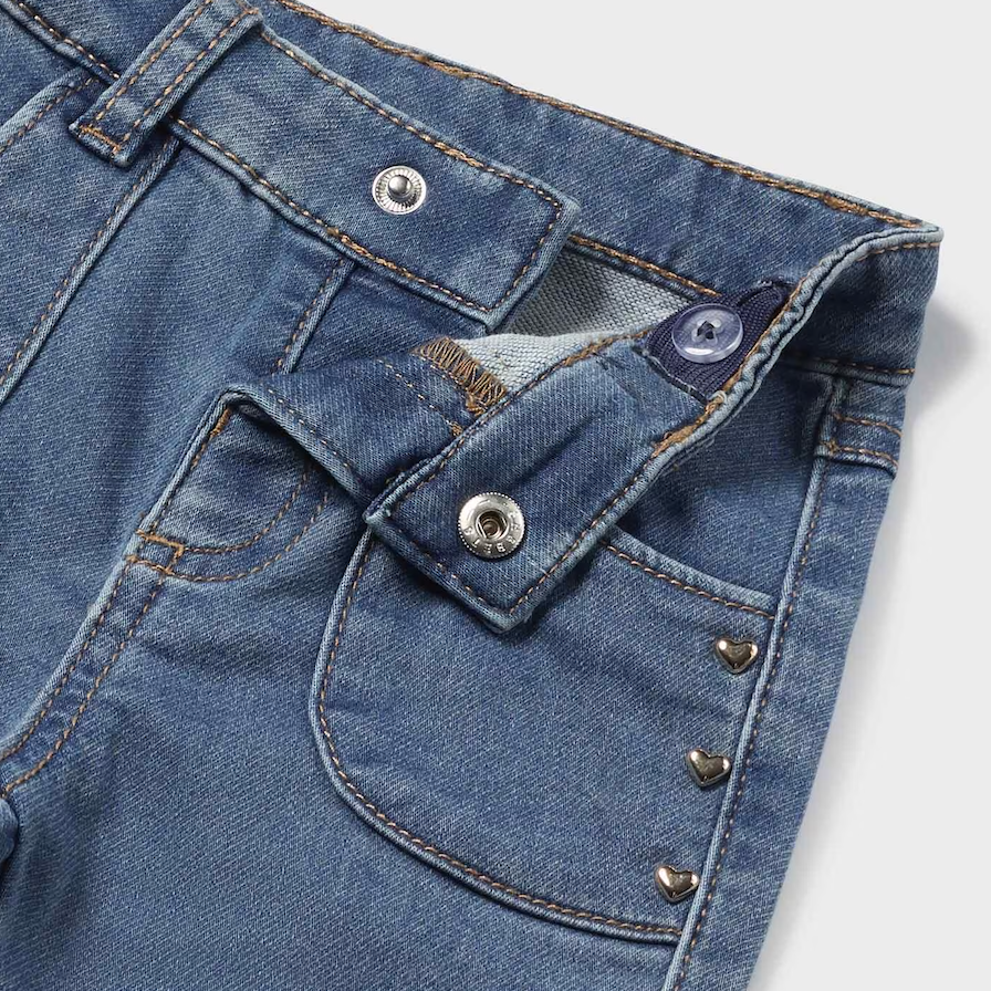 Add some flair to your little girl's wardrobe with these Medium Flare Long Trousers. These jeans feature a stylish flare design, with adorable gold heart detailing on the pockets. Perfect for making a statement and keeping your baby girl comfortable at the same time!