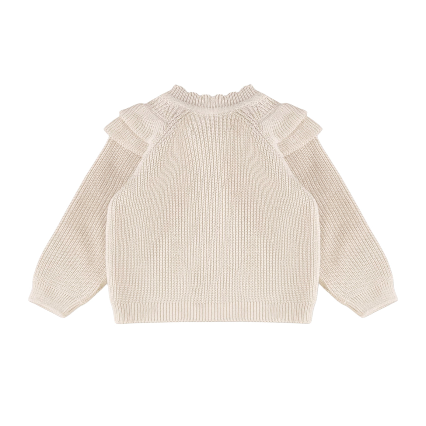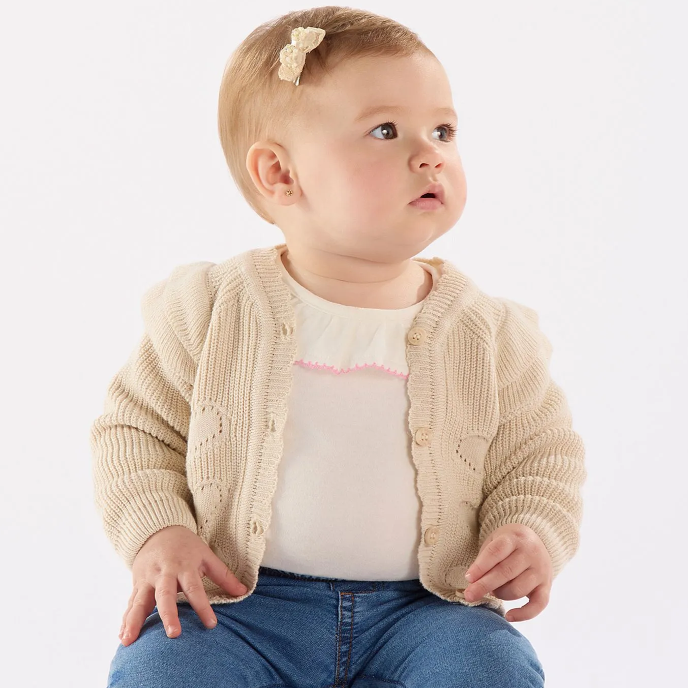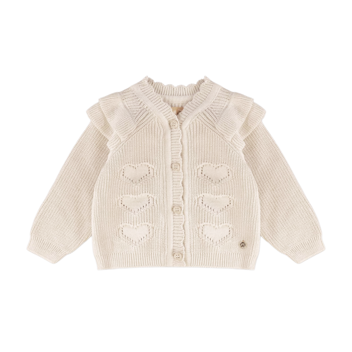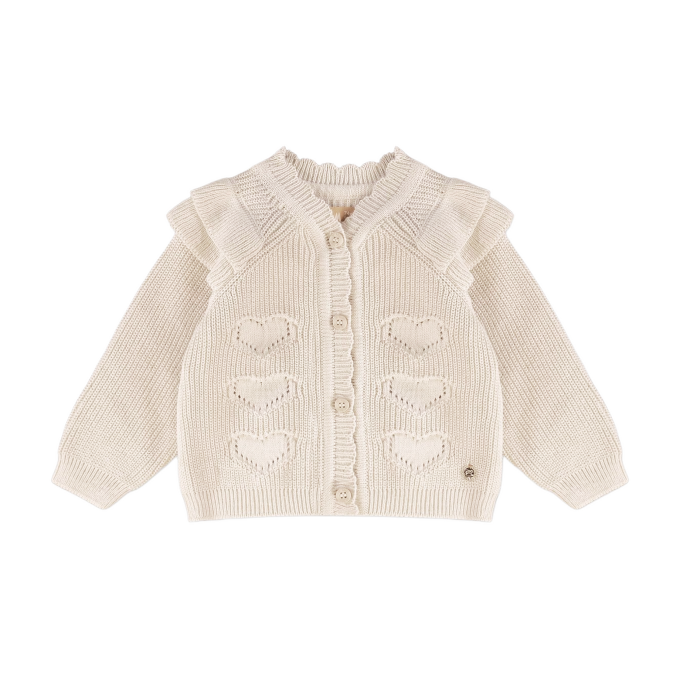 Wrap your little one in warmth and love with our Little Love Knitted Cardigan, designed with charming heart-shaped knit that adds a playful touch to her wardrobe. Crafted from a soft blend of acrylic and cotton, this cardigan features a sweet round neck adorned with a delicate wave finish, ensuring comfort and style. The raglan sleeves are enhanced with delightful ruffles, while the ribbed cuffs and hem provide a snug fit that keeps chilly air at bay. With a convenient front opening secured by buttons and buttonholes, dressing your baby has never been easier. This versatile piece is perfect for layering over dresses or pairing with her favorite outfits, making it an essential addition to her cold-weather collection. Let her shine in this heartwarming cardigan that combines functionality with a sprinkle of sweetness!