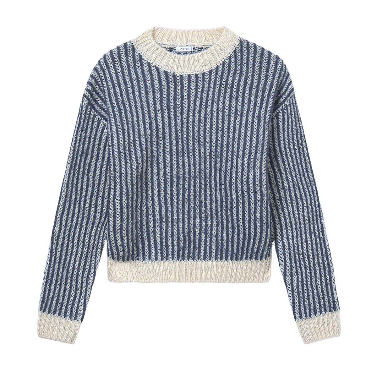 A cozy classic with a modern twist, this long-sleeved sweater for girls features a round neckline and a two-tone ribbed knit design. The contrasting cuffs, hem, and neckline add an extra touch of style, making it perfect for pairing with skirts, jeans, or trousers all season long.