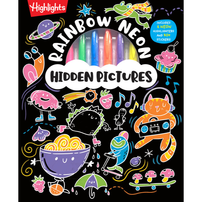 This epic rainbow party of on-the-go neon coloring includes 6 eye-popping neon markers, 40+ ready-to-color stickers, and 64 pages of irresistible characters and whimsical scenes, making this Rainbow Neon Hidden Pictures activity book a gift that kids love.