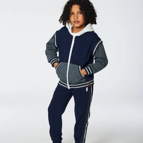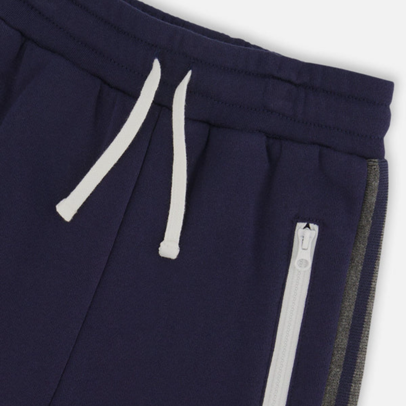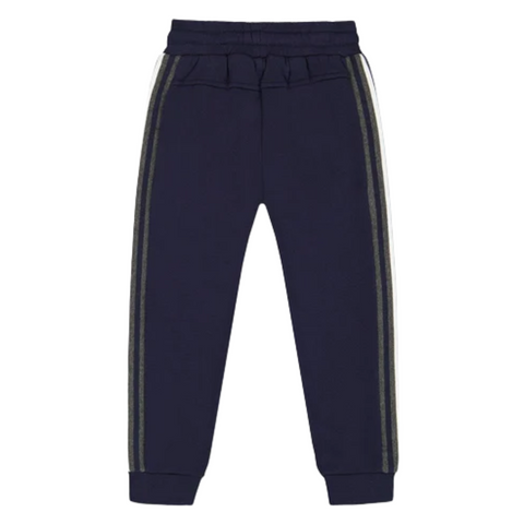 These stylish navy jogging pants are perfect for active boys who love comfort and functionality. Featuring a drawstring waistband for a customizable fit, these sweatpants are designed with striped rib knit panels down the sides for a trendy touch. The contrast zip front pockets provide secure storage for small essentials, while the elastic ankles ensure a snug fit during playtime. Made from a soft blend of 80% cotton and 20% polyester, these pants are both durable and comfortable, making them a must-have addition to any young boy's wardrobe. Fits true to size for easy wear!