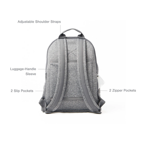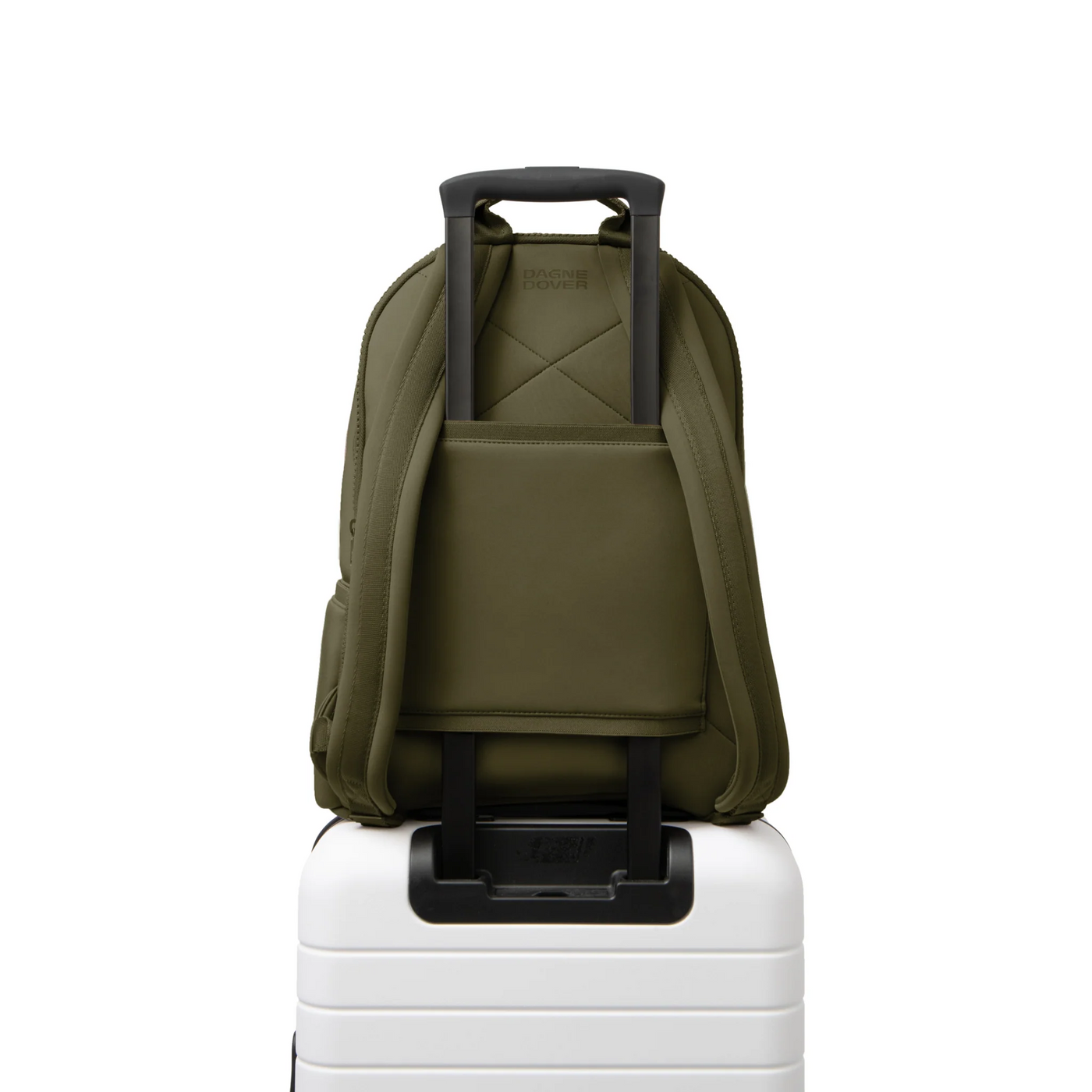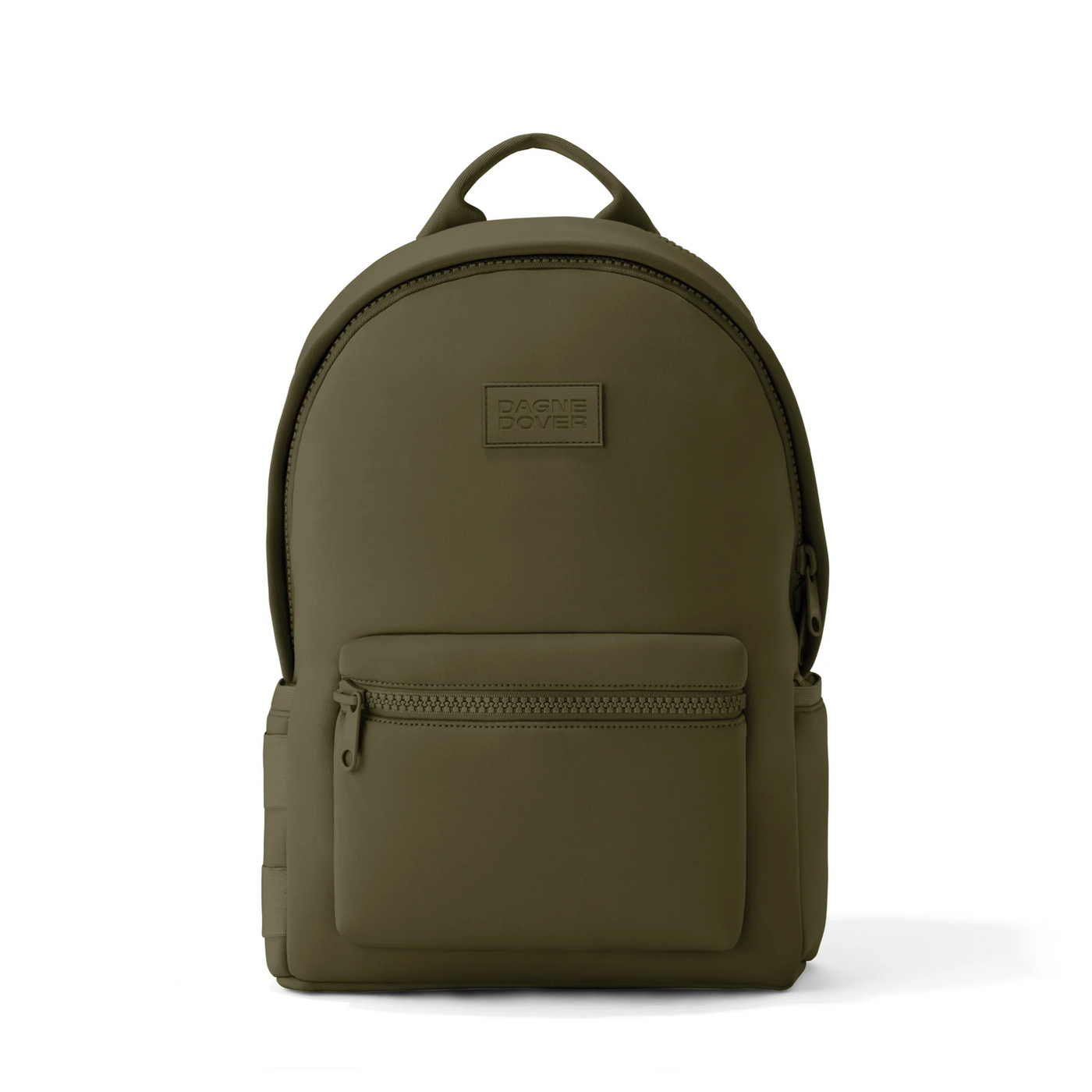Introducing the Dark Moss Medium Dakota Backpack! This water-resistant backpack is perfect for weekend getaways and can hold extra shoes and outfits. Its laptop sleeve fits most 16” laptops and includes a neoprene luggage-handle sleeve. The REPREVE® recycled lining, shoe bag, and dust bag make it environmentally friendly and 100% vegan. With plenty of space for all your essentials and a playful design, this backpack is your new go-to for any adventure. Neoprene products can be hand washed with a mild detergent in cold water.