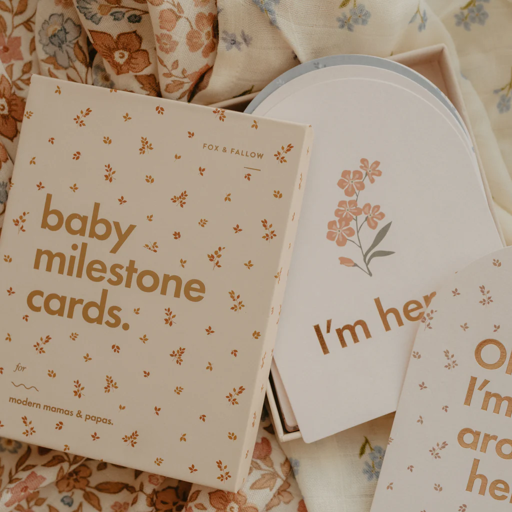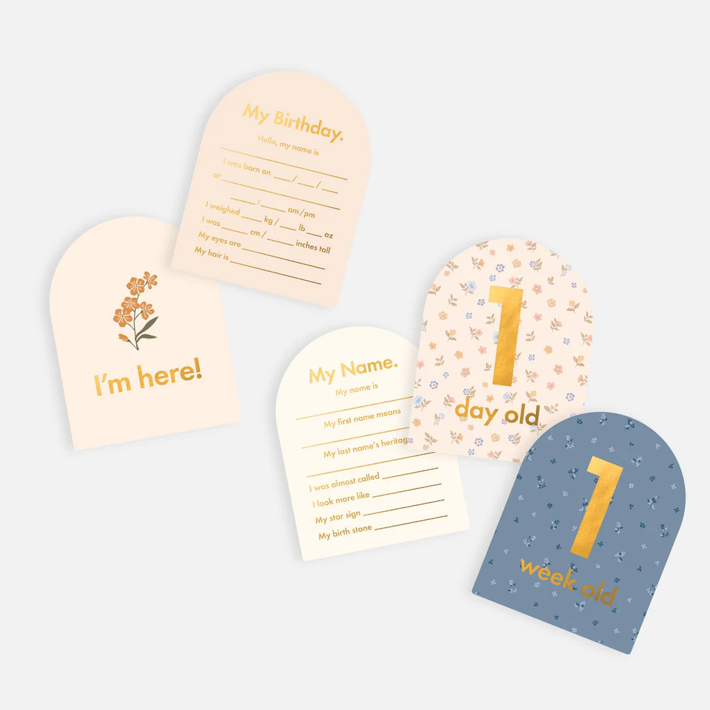 Capture and cherish every milestone with Broderie Baby Milestone Cards. From birth announcement to one year and beyond, these pastel and gold foil cards are perfect for modern parents to share with friends and family. 34 round-cornered cards make it safe for little hands.