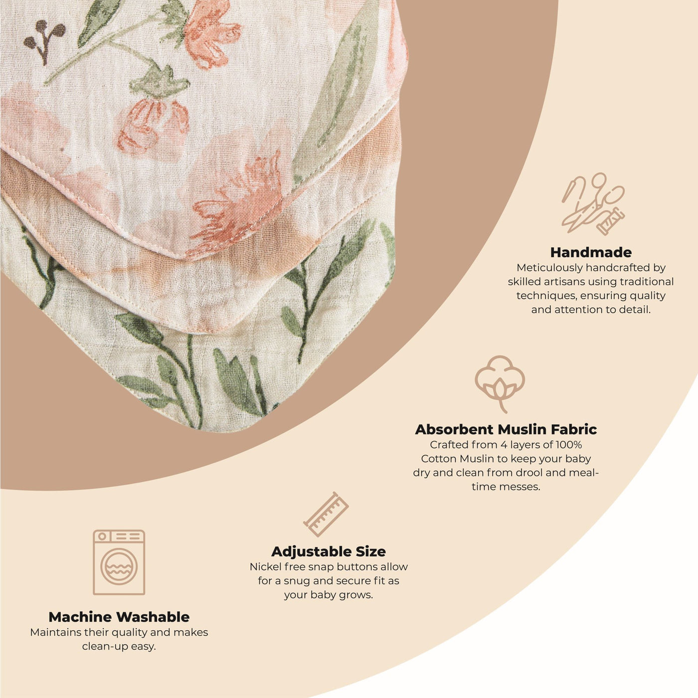 The Parker Muslin Bib Set features a set of three stunningly beautiful baby bibs. Each features a unique design and has snaps that make it adjustable. So, it can grow along with your baby. This baby bib set also perfectly matches our set of Parker burp cloths, swaddle blankets, and baby nursery bedding. The collection would make a beautiful gift.