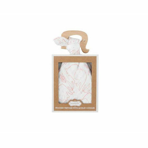 Natural beech wood teether features removable muslin pink elephant blanket.