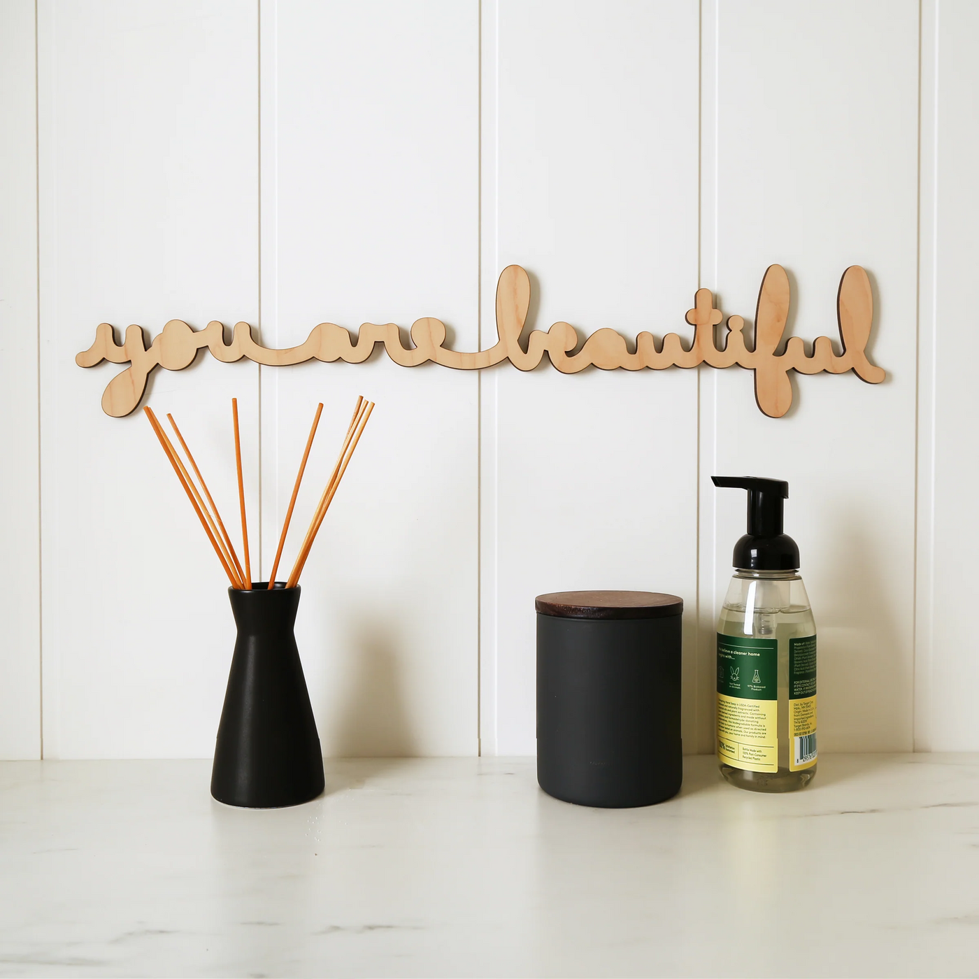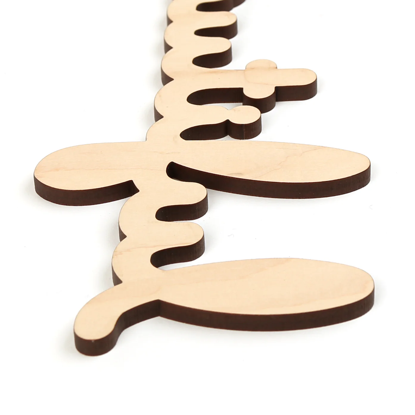 Adorn your wall with this laser cut cursive wood piece. This piece measures 22" wide x 4" high x .25" thick, & is made of maple plywood.