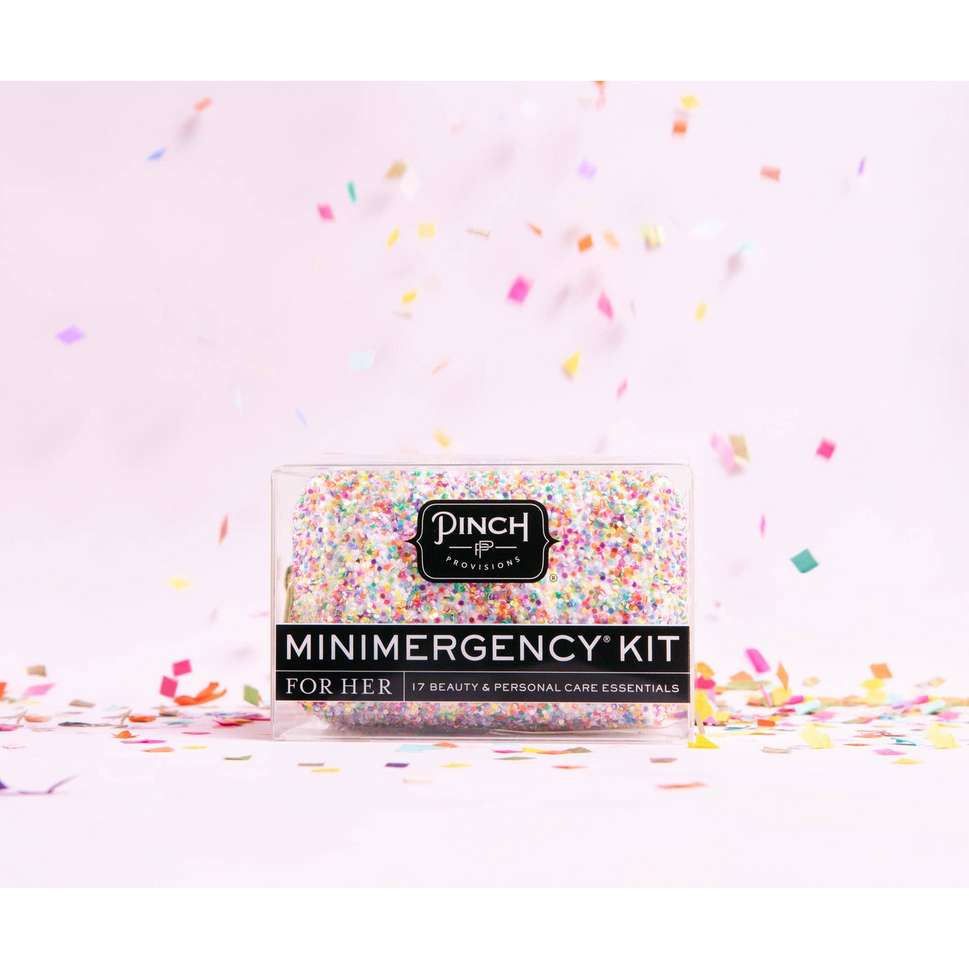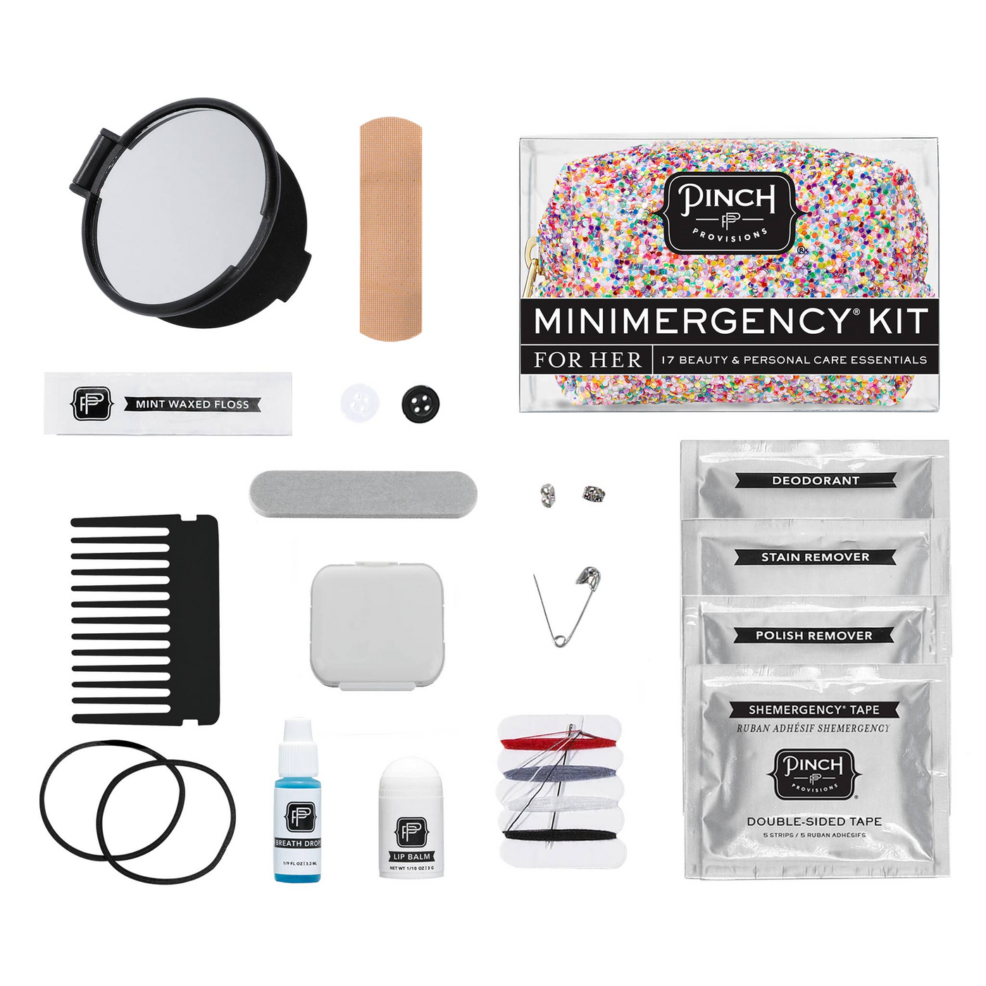 We traveled the world (okay, not really) to find the happiest glitter ever made. And with the Funfetti Glitter Minimergency Kit, we think we’ve found it. It’s the perfect mix of multicolor and sparkle, and with 17 emergency essentials, contains everything you need in a pinch! It's the perfect way to say Happy Birthday or throw it in your purse for a party! The kit contains: stain remover towelette, emery board, double-sided tape, pill container, safety pin, lip balm, mending kit, mini comb, hair bands, dental floss, earring backs, adhesive bandage, nail polish remover pad, deodorant towelette, extra buttons, compact mirror and breath freshener.