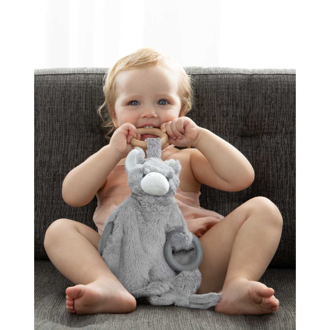 Little G Cuddle-Boo is the perfect playtime teether and tag-a-long! Featuring ultrasoft faux fur, two LOVE Saver™ Teether Toys, and a removable organic maple wooden teether making it perfect to throw in the wash!