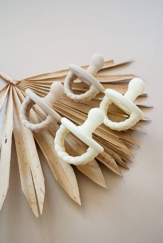 Our precious pacifiers feature a one-piece design made of 100% food grade silicone. The soft, orthodontic nipple shape reduces pressure on the gumline while soothing baby, ages 6-18 months. Free of PVC and BPA. CPSIA compliant.