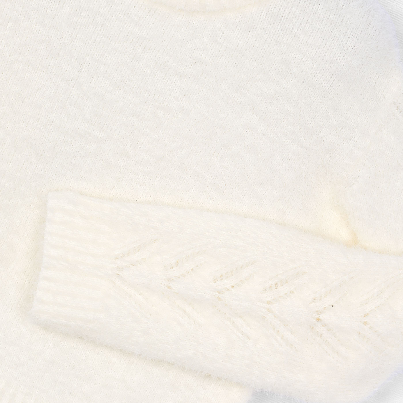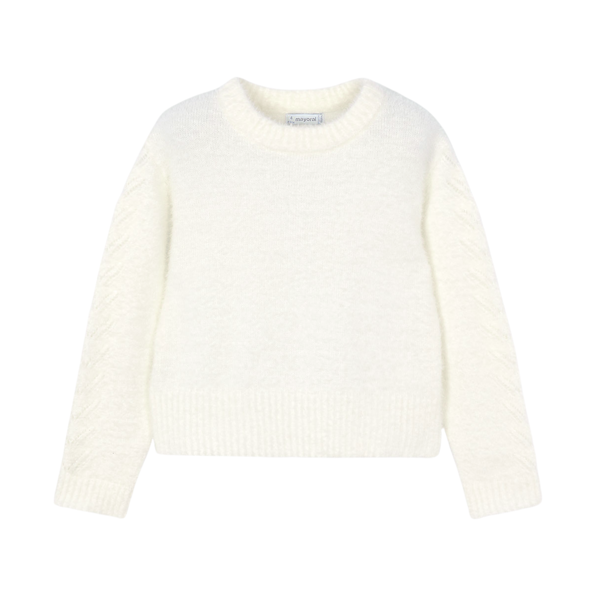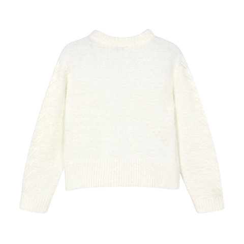 Cozy up in style with this ultra-soft chenille sweater for girls. Featuring long sleeves, a round neckline, and delicate openwork detailing on the sleeves, this knit is both classic and charming. The faux fur–like texture gives it a smooth, plush feel, making it a perfect layering piece for chilly days.