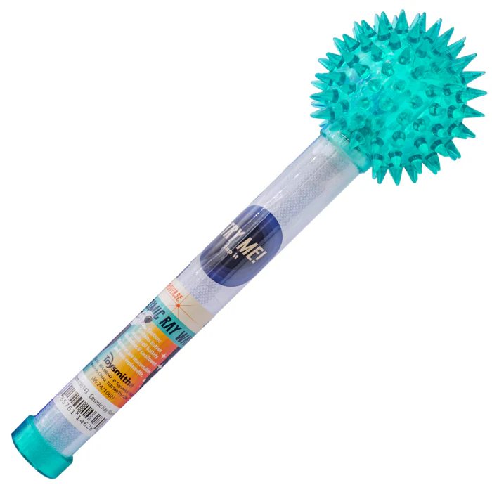 Tap this popular Cosmic Ray Light-Up Wand toy from Toysmith, and it flashes with a 15-second multi-colored light show. Wands have a squeezable soft rubber spiky top and come in 4 assorted colors. Available in turquoise, orange, blue, and purple. Each wand includes non-replaceable batteries.