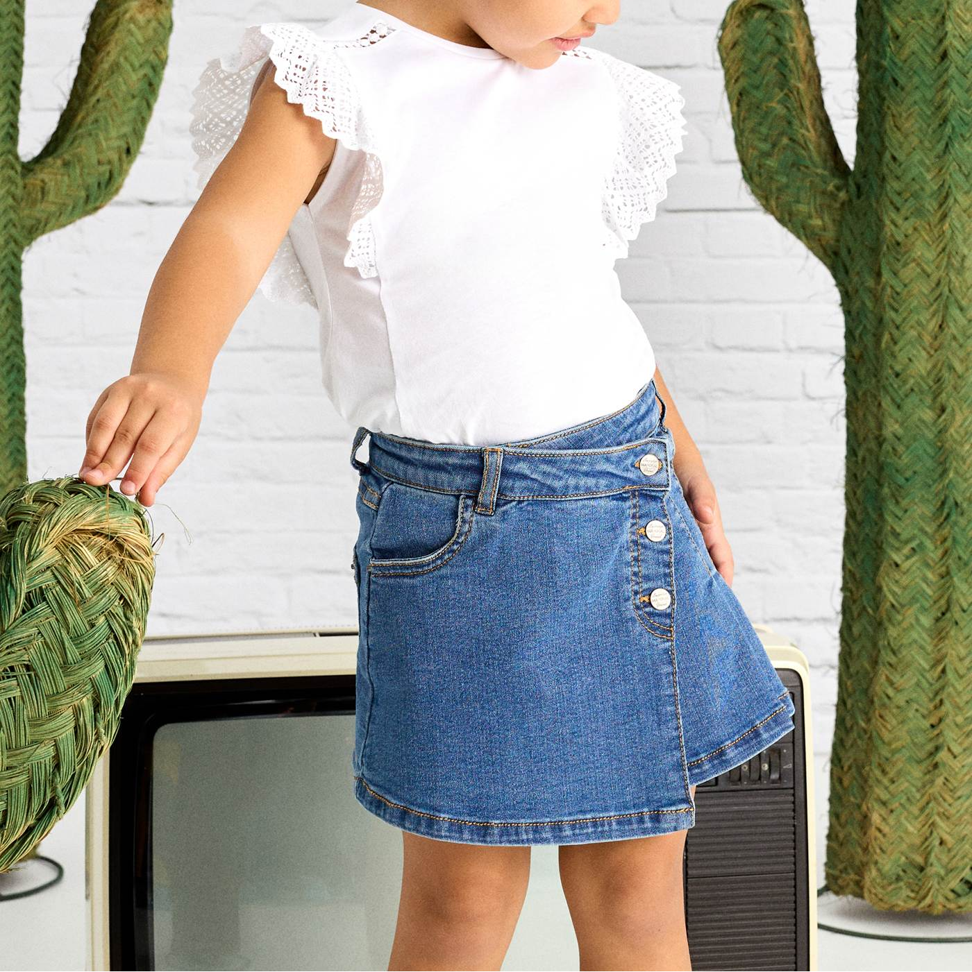 This stylish kid girl's pleated denim skirt is a perfect blend of classic and contemporary! Featuring an asymmetrical design with a criss-cross waistband, it showcases diagonal silver button detailing that adds a unique twist. With three pockets—one in the front and two in the back—plus belt loops for added versatility, this skirt is both functional and fashionable. Made from 100% cotton, it promises comfort and durability for all-day wear. Elevate your little one's wardrobe with this chic denim skirt that’s sure to turn heads!