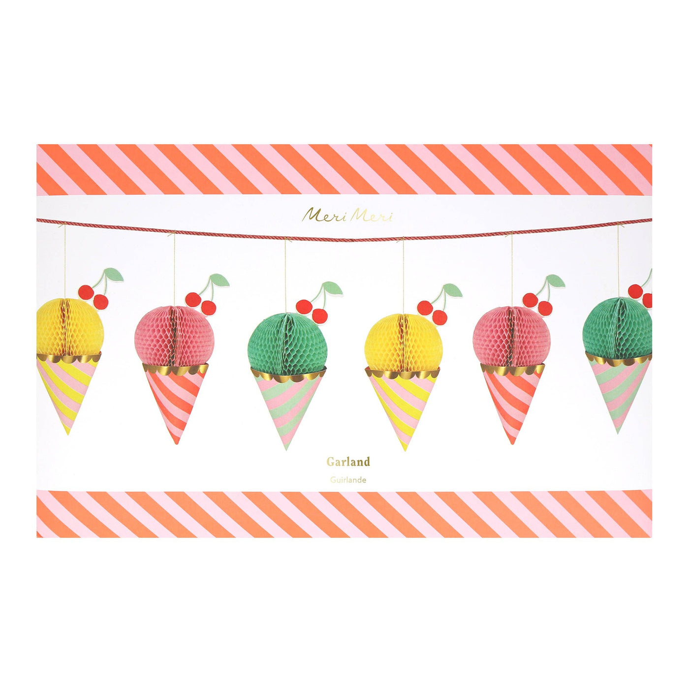 This quirky, fun garland features 8 honeycomb ice creams with shiny gold foil accents. The honeycomb tissue comes in mint, pink, and yellow and opens to a full 180 degrees on both sides. Hidden magnets keep the honeycomb open while cherry pieces, along with double-sided tape, can be added to the garland. The ice creams are attached with metallic gold cord and a playful addition of pink cord. Simple self-assembly is required for this 6' long garland (10' including excess cord).