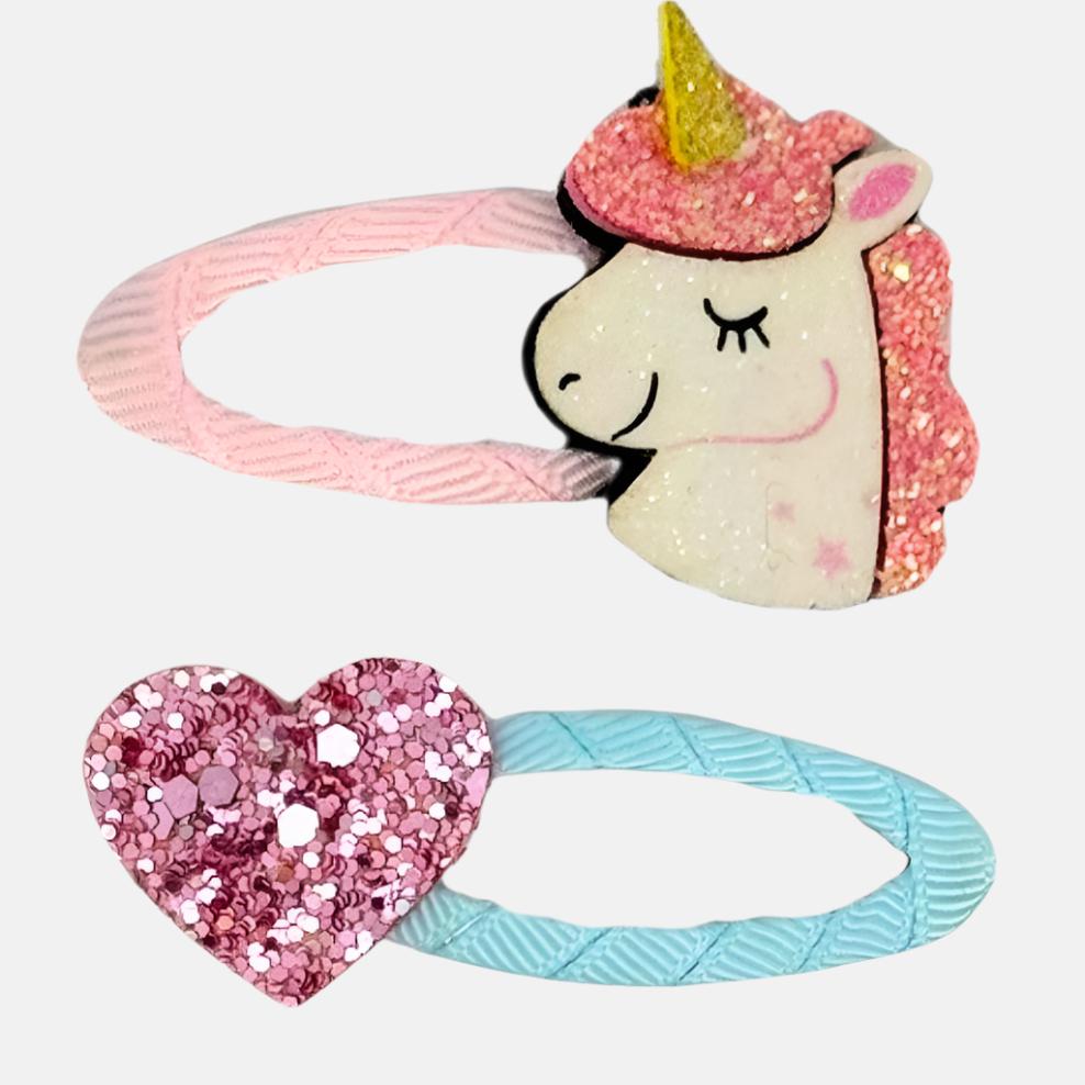 Unleash your little one's personality with the Mix and Match Hair Clip Heart. These girl's hair clips are perfect for fastening hair back, allowing for all-day play. With a glitzy unicorn and a shining, shimmering, splendid heart, these unique clips are sure to show off your child's unique style.