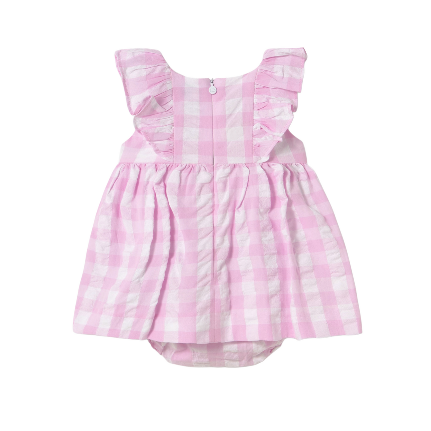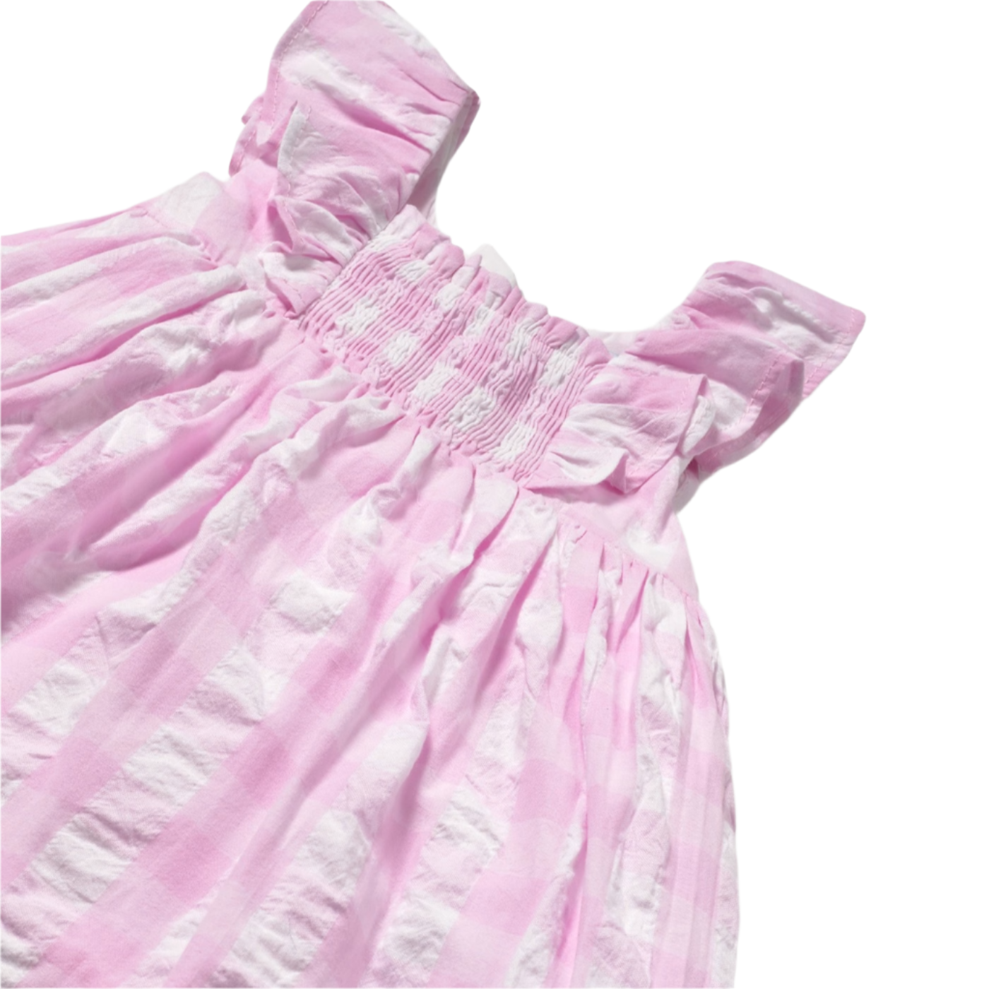 This adorable baby girl's pink and white gingham dress is the perfect addition to your little lovebug's spring wardrobe! Featuring charming flutter sleeves and delightful smocking detail in the front, this dress combines style and comfort effortlessly. The convenient zipper at the back makes dressing a breeze, while the matching bloomers complete the look for any occasion. Whether it's Easter brunch, family photos, or just a sunny day out, this sweet dress set is sure to make your little one shine!
