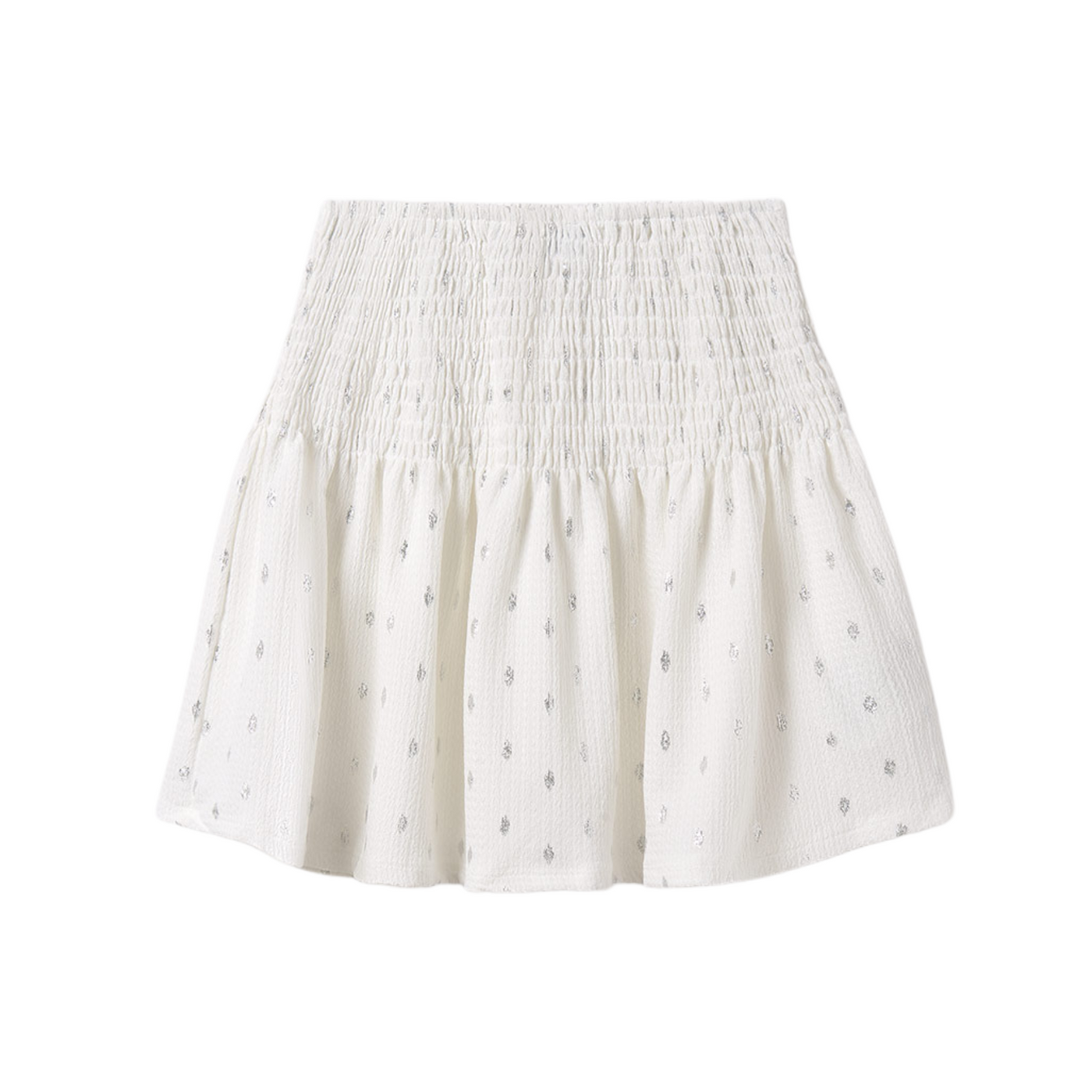 This adorable kid girl's white mini skirt is perfect for playful days and special occasions alike! Featuring a charming silver foil diamond print this skirt adds a touch of sparkle to any outfit. Made from lightweight and breathable bambula fabric, this skirt ensures comfort with its crinkled texture and relaxed fit. The smocked waist provides a snug yet flexible fit, while the above-knee length allows for easy movement and stylish flair. Dress her up for a party or keep it casual for a day out—this versatile skirt is a must-have for every little fashionista!