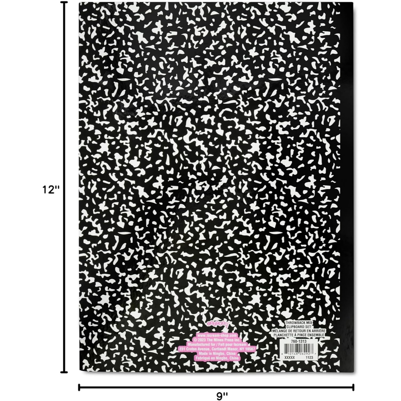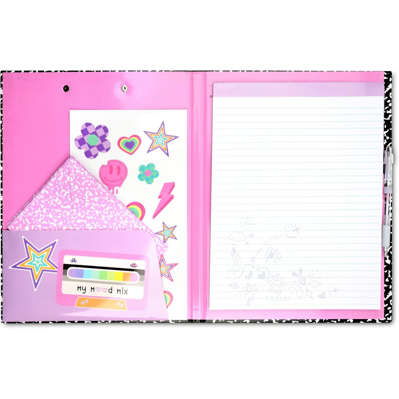 Full-sized portfolio measures 9" x 12" wide and features a clipboard front and an interior pocket filled with a sheet of stickers and 10 colorful envelopes