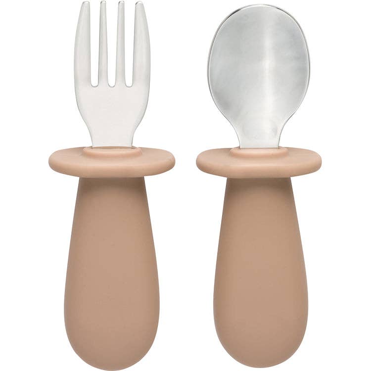 The toddler cutlery set includes a fork and spoon featuring a stainless steel mouthpiece and a chubby silicone handle - perfect for small hands to grip.