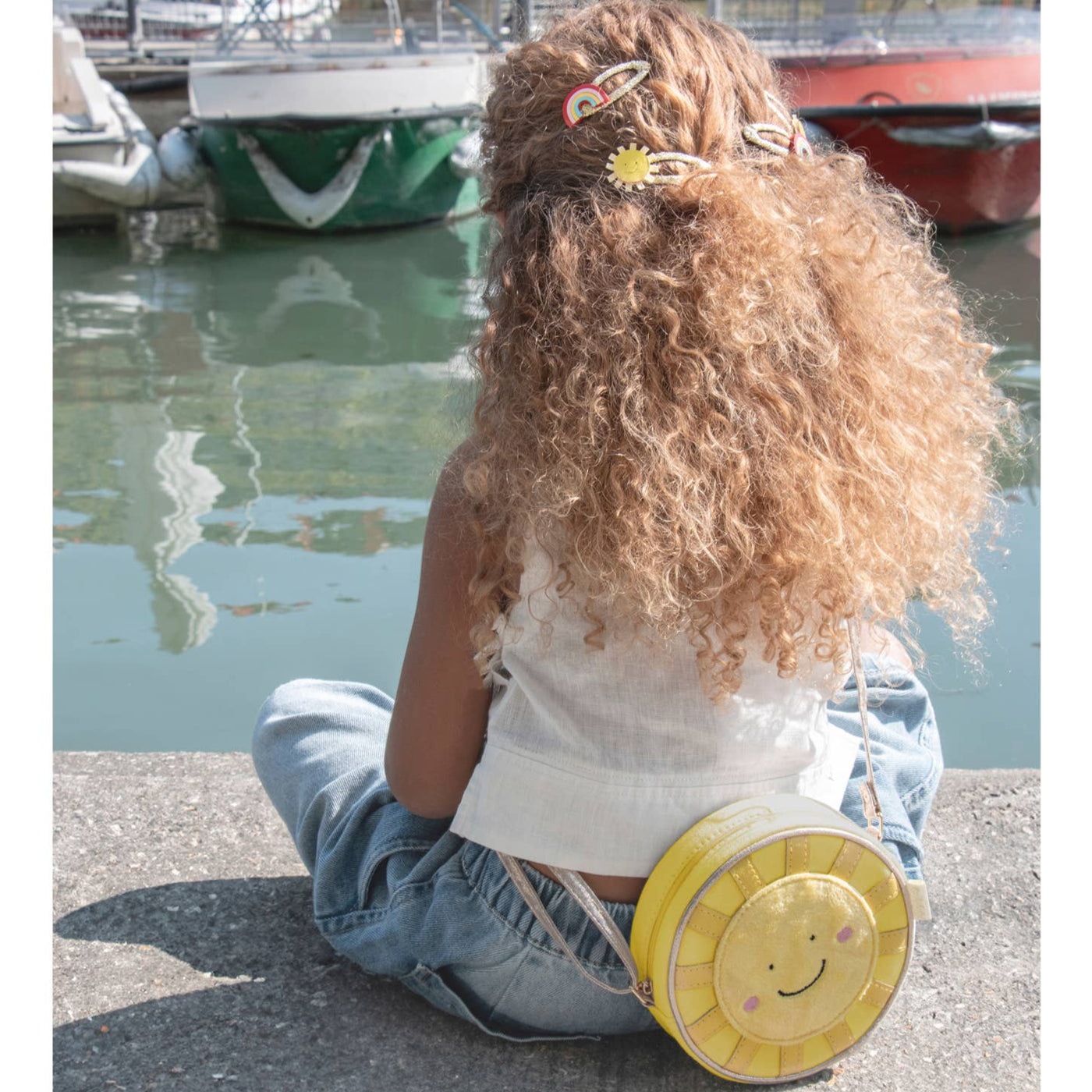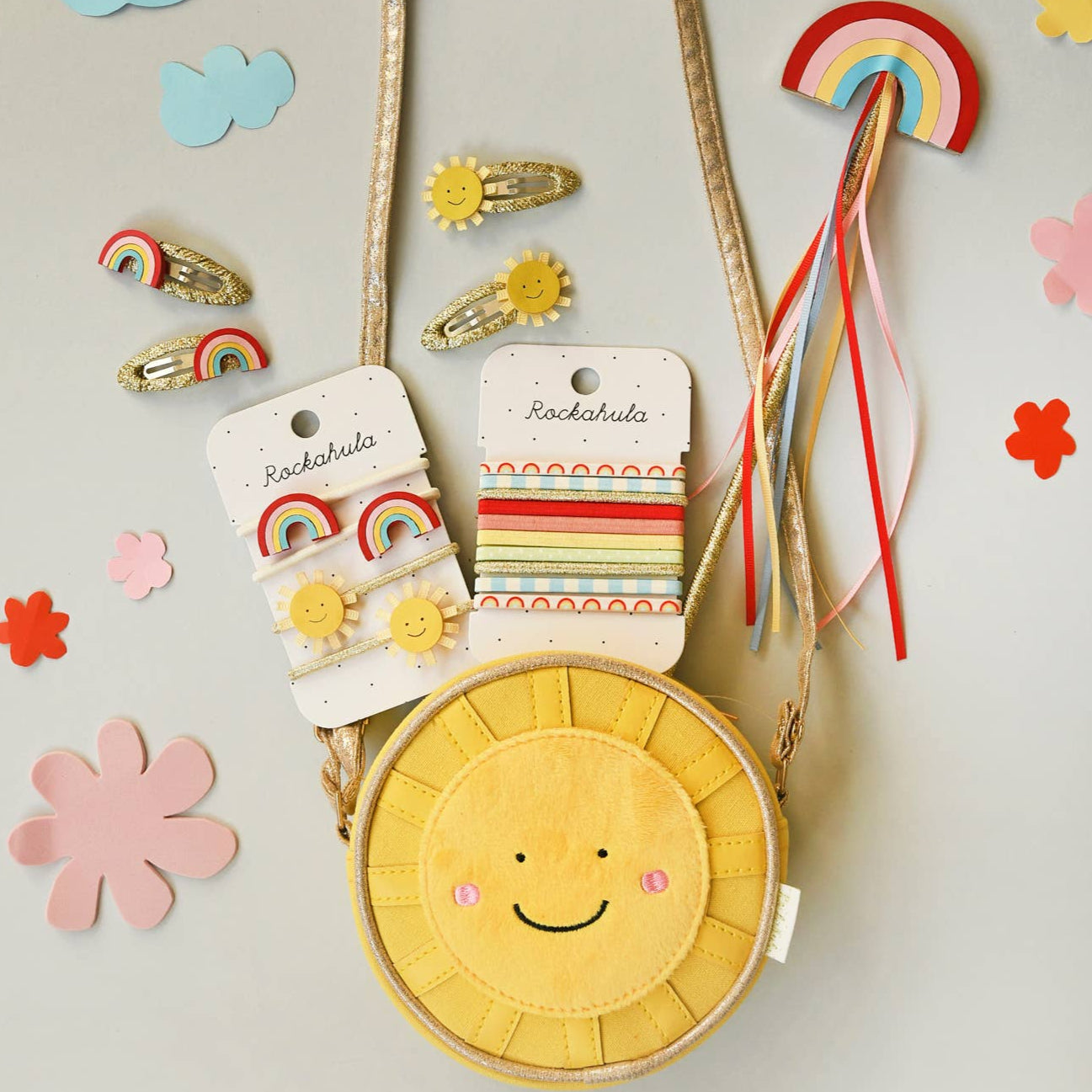 Feel the vintage vibes with these bold and beautiful rainbow clips! Created from a bold rainbow palette, these clips are sat upon gold grosgrain wrapped snap clips. Made with recycled felt and PU.