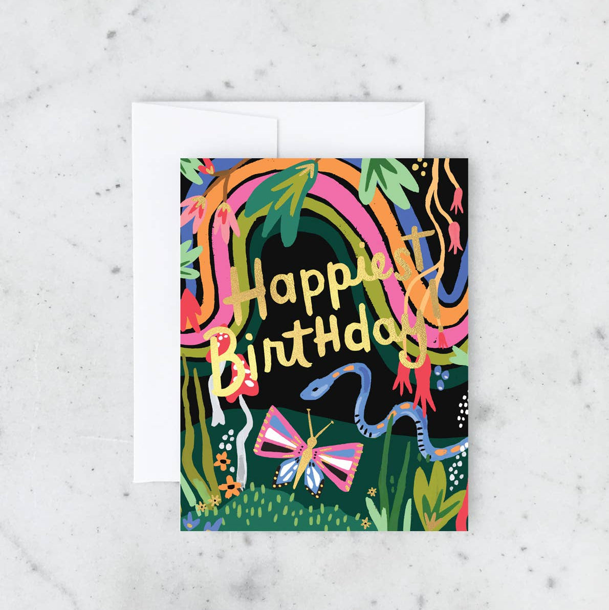 This colorful, wild fantasy garden sends the prettiest birthday wishes to your favorite nature-lover. Idlewild Co. greeting cards feature our original, hand-painted illustrations, and are printed in vibrant color on beautiful, opaque FSC-Certified papers. We pair each with a matching envelope and they are delivered in a cello sleeve–or opt in for our "naked" option, which will ship packaging free, and includes a "card clasp" removable sticker packaging.