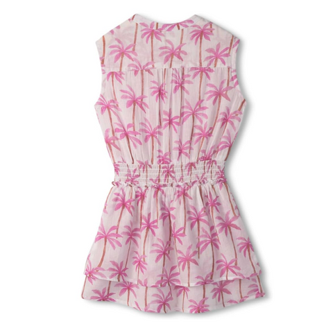 This boasts a flattering silhouette with a crew neckline and cap sleeves. The pull-on style dress features a half-button closure, smocked waist detail, an allover fun print, and a two-layered skirt.