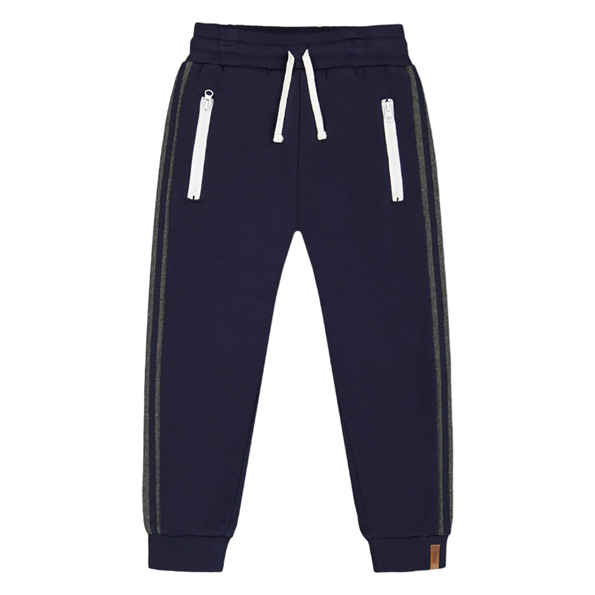 These stylish navy jogging pants are perfect for active boys who love comfort and functionality. Featuring a drawstring waistband for a customizable fit, these sweatpants are designed with striped rib knit panels down the sides for a trendy touch. The contrast zip front pockets provide secure storage for small essentials, while the elastic ankles ensure a snug fit during playtime. Made from a soft blend of 80% cotton and 20% polyester, these pants are both durable and comfortable, making them a must-have addition to any young boy's wardrobe. Fits true to size for easy wear!