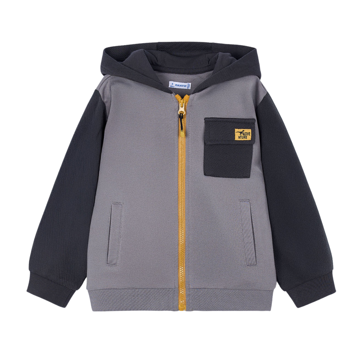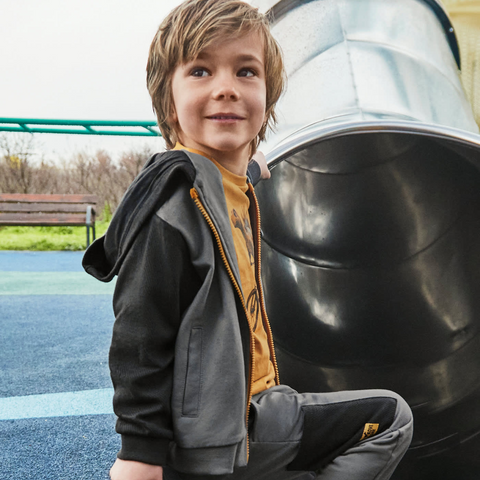 A cool-weather essential with a sporty twist, this Grey Color Block Zip Hoodie is perfect for school days, playground adventures, and everything in between. Designed with contrast sleeves and a bold yellow zipper, it balances comfort with everyday style. A chest pocket and handy side pockets add function, while the soft cotton blend keeps him cozy all season long.