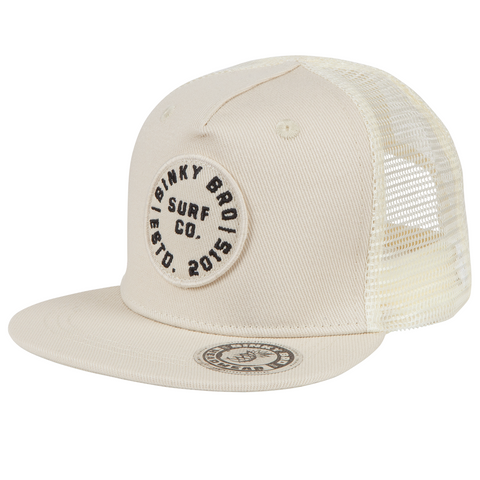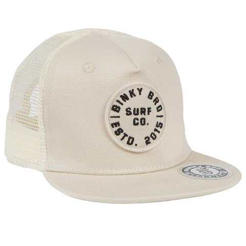 The Kandui snapback hat has cream paneling, a cream bill, with a cream and black embroidered "Binky Bro" patch on the front.