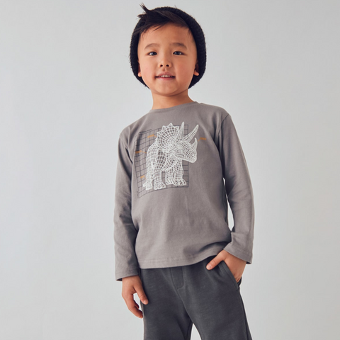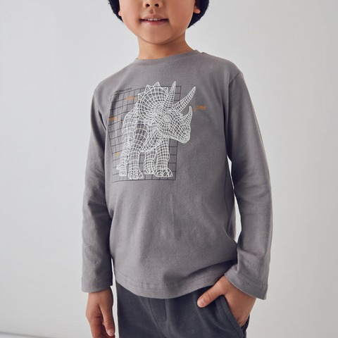 Let his imagination roam with this fun long sleeve tee featuring a bold dinosaur grid graphic that comes to life in the dark! Part of the interactive PLAY WITH collection, this tee is designed to spark creativity while keeping him comfortable all day long.