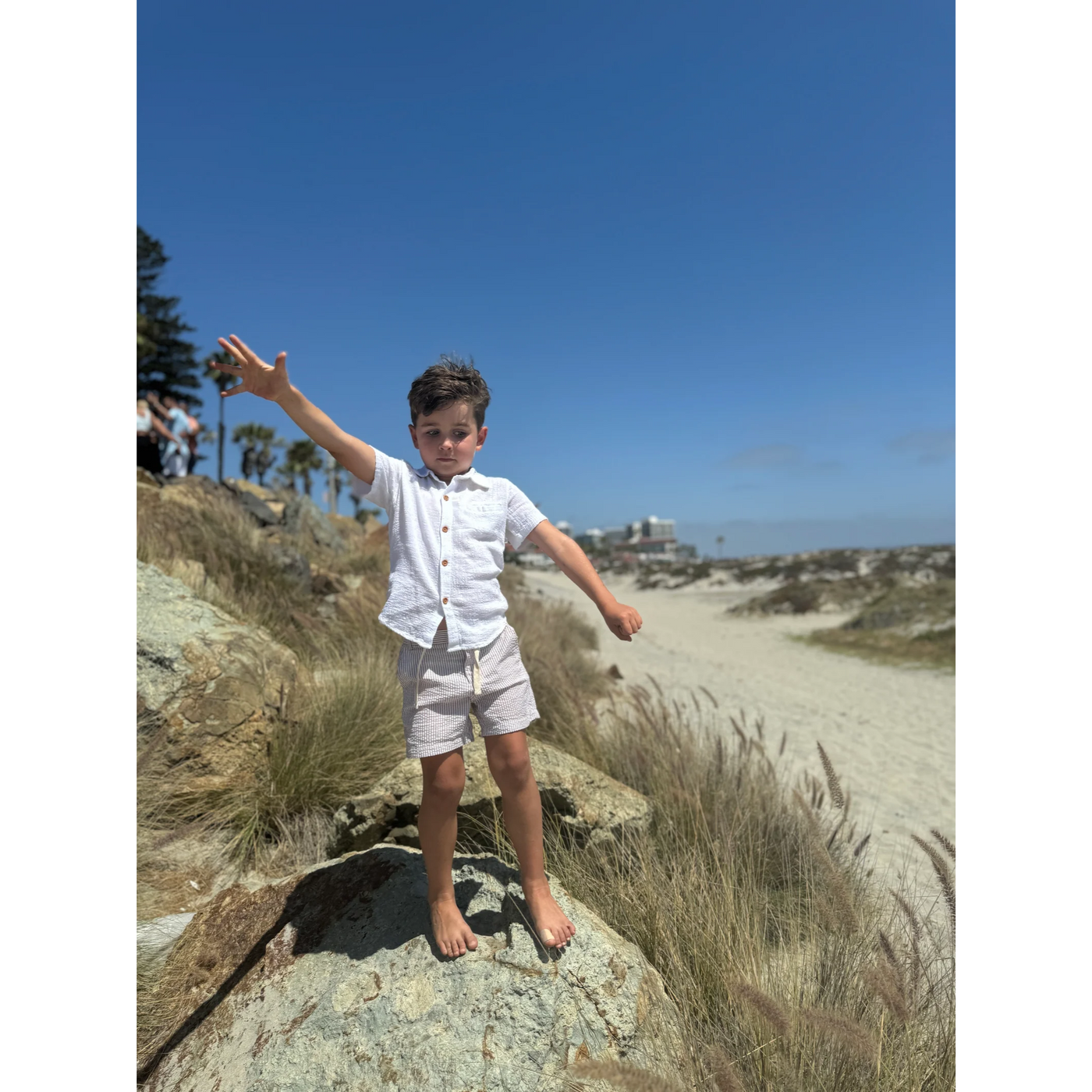 Elevate your child's wardrobe with this grey micro plaid woven shirt, crafted from soft cotton for ultimate comfort. The button-down collar adds a touch of sophistication, while the subtle plaid pattern in grey and white provides a stylish yet understated look. Perfect for both casual outings and special events, this shirt is a versatile addition that combines modern flair with classic charm.