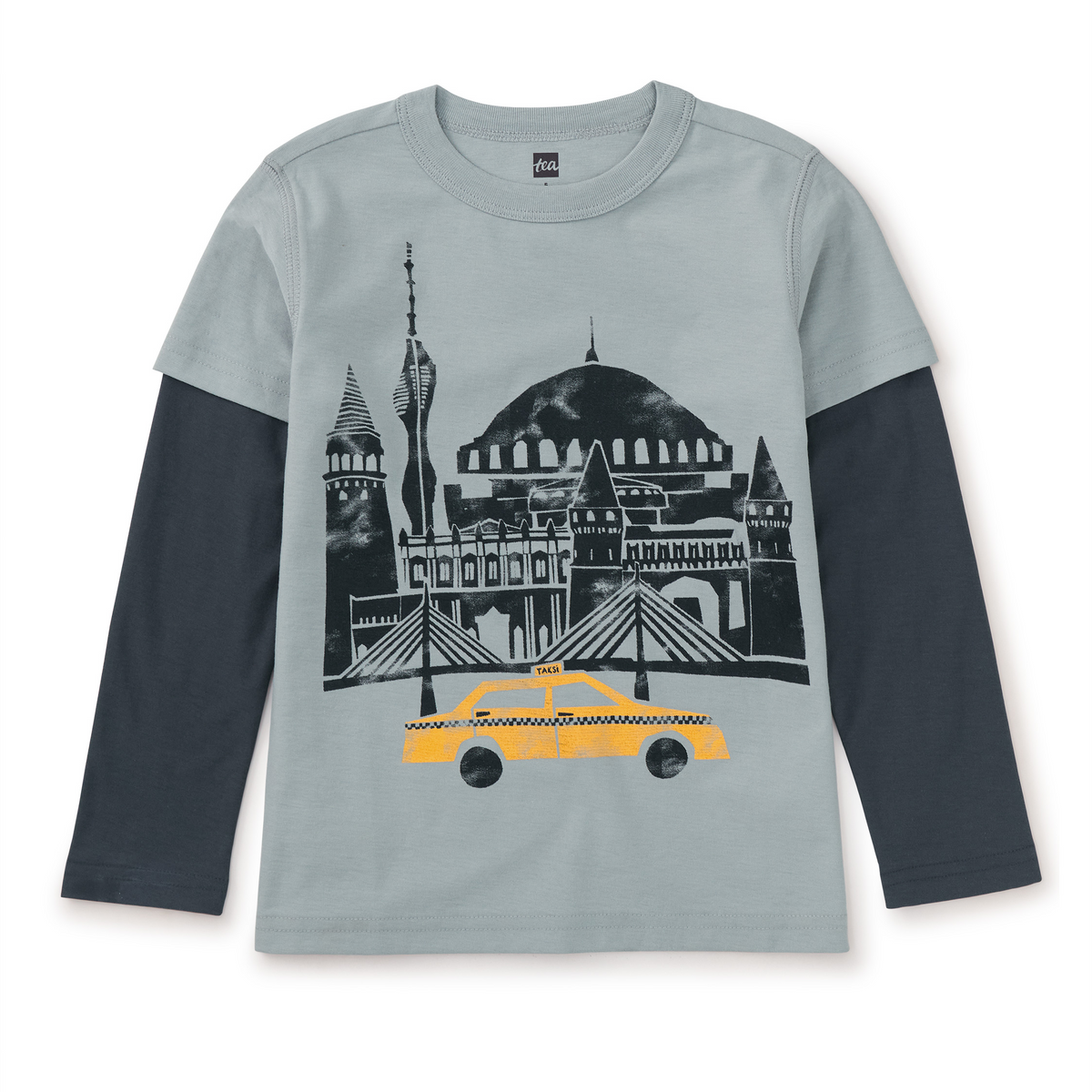 Let your kiddo take an exciting ride through the vibrant streets of Istanbul in this custom graphic featuring a bright yellow taxi set against the city's dramatic silhouetted skyline. This fashion-forward top offers a handsome, layered look without the bulk. Made with our signature soft and durable 100% cotton, this fall-ready long-sleeve tee will hold its color and shape, season after season.