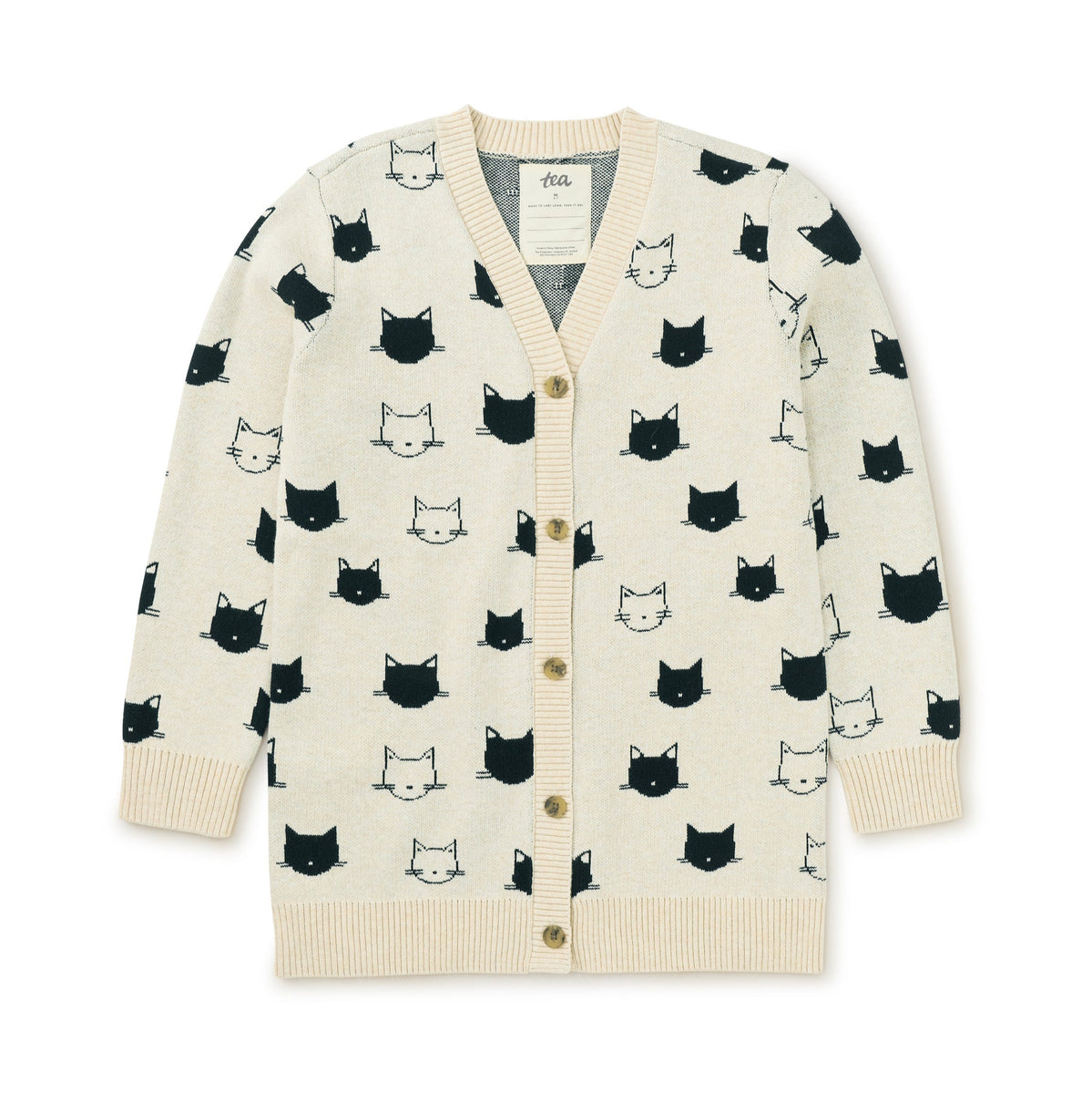 A cozy favorite returns with extra charm. This longer-length cardigan features a delightful repeat print of iconic cat faces in playful contrast colors. Crafted from 100% combed cotton, it's made to be soft, breathable, and built to last. The easy fit and v-neck design layer effortlessly over any outfit, while the wooden-style buttons add a timeless touch. An heirloom-quality piece made to be passed down, complete with a handy name tag inside for easy identification at school or play. Purr-fectly suited for cat lovers and cozy days.