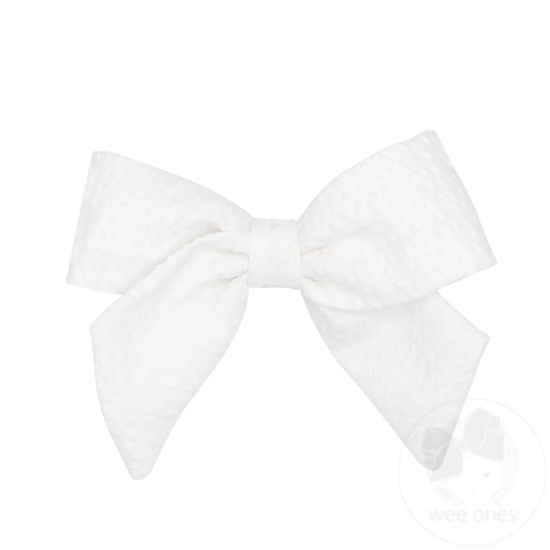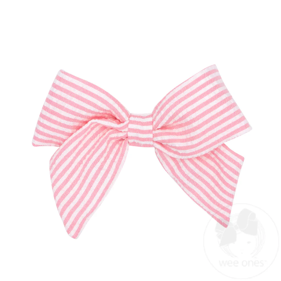 This Medium Genuine Seersucker Fabric Bowtie with Tails brings timeless summer style to your little one’s look, adding a light and breezy touch perfect for warm days. Soft and classic, it’s the must-have accessory for sunny adventures. This bow is sure to stay in her hair all day with our patented WeeStay™ no-slip hair clip.
