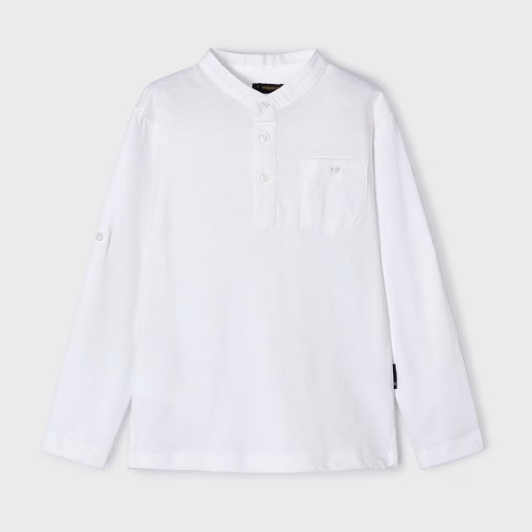Elevate your wardrobe with our White Cotton Mao Collar Tee. Crafted in soft cotton, this Henley top effortlessly transitions from casual to dressy. Experience comfort like never before with its relaxed fit. A must-have for any occasion.