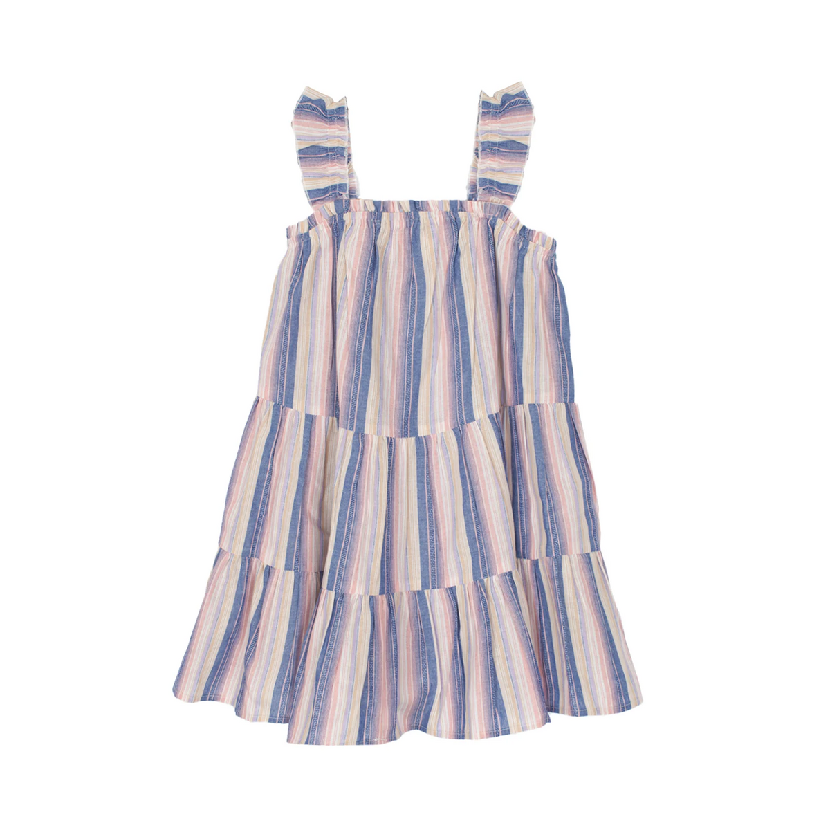 This girl's sleeveless dress features soft multicolor stripes in soothing hues of blue, pink, and cream. Made with lightweight woven fabric, it details a playful ruffle shoulder straps and a tiered design for added volume and movement. Perfect for warm weather, this breezy style offers a relaxed fit and effortless elegance.