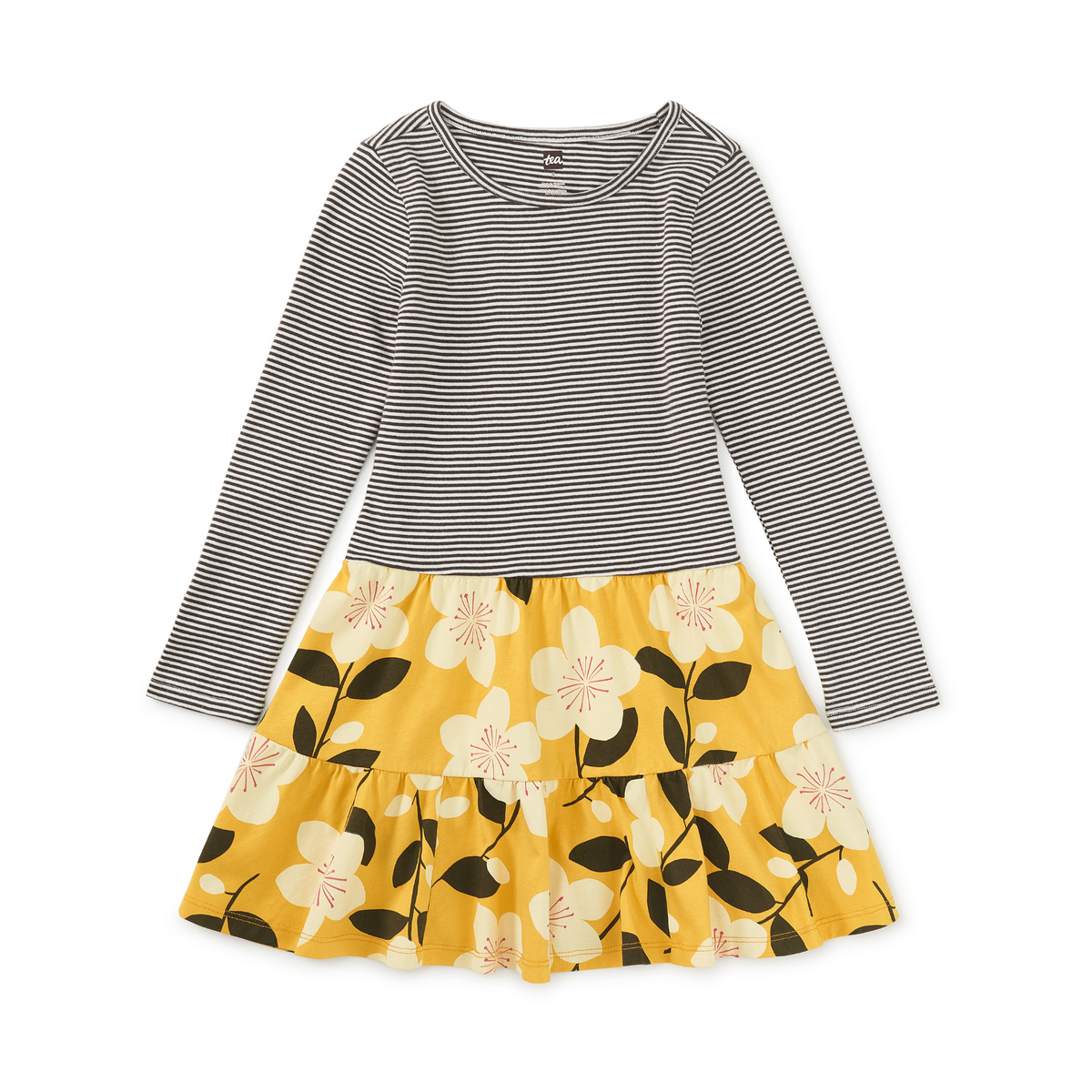 A go-to for twirl-loving kids, this dress features a fitted cotton rib bodice and a tiered cotton jersey skirt that flares with every spin. The long sleeves and crew neckline offer everyday comfort, while the below mid-thigh length ensures easy movement from classroom to playground. Designed for parents seeking a fuss-free outfit that combines comfort, durability, and playful style in one piece.