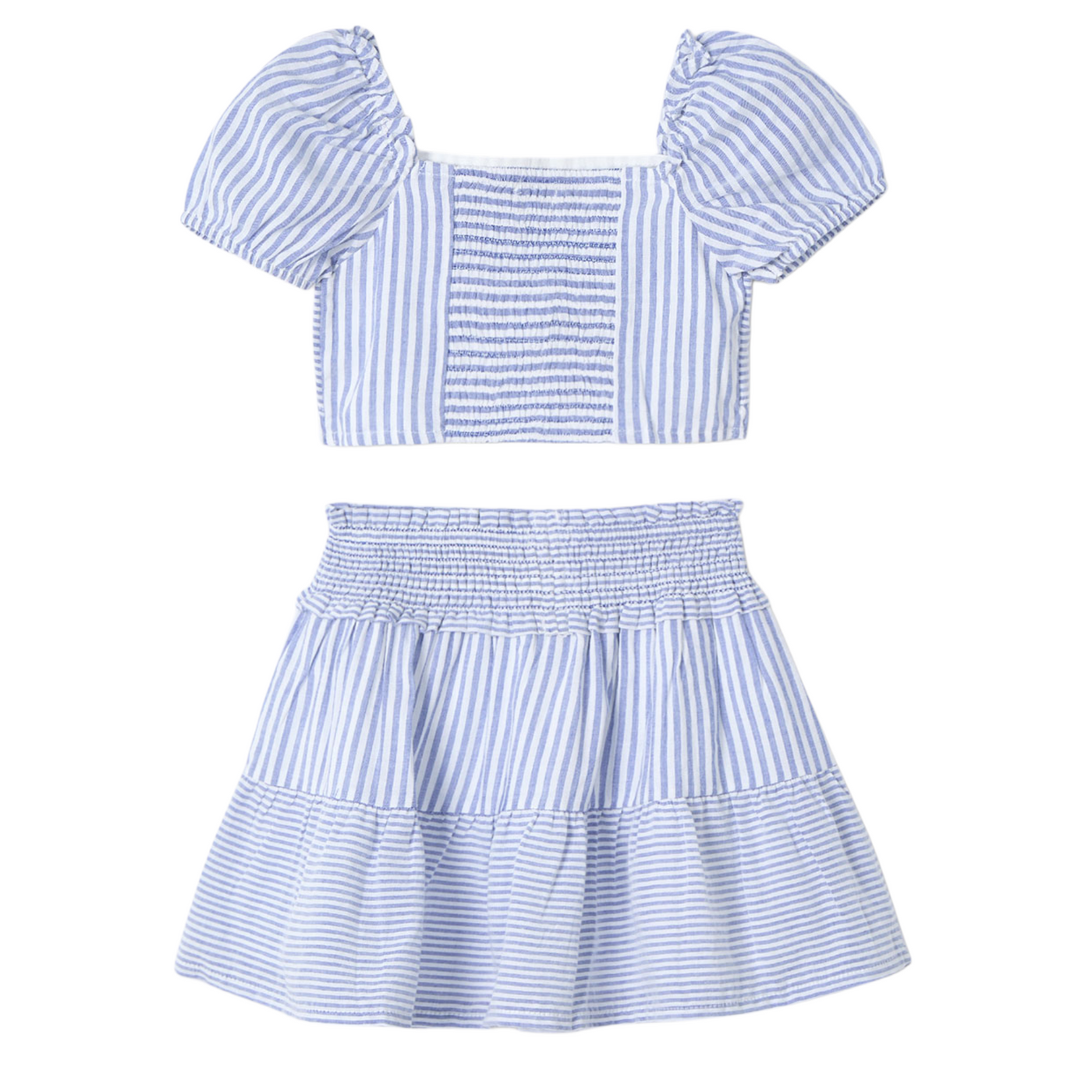 This set includes a short-sleeve top and a matching skirt, both featuring a striped pattern. The top is designed with smocked detailing and a bow for added texture, while the skirt has an elastic waistband and smocked elements for a coordinated look. Comfortable and practical, this set is perfect for warm-weather days and easy to mix and match with other items.