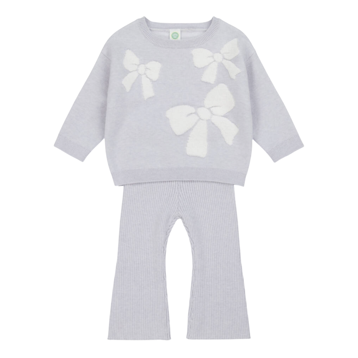 Wrap her in charm and comfort with this pale lilac-grey knitted set. The soft sweater features three playful ivory bow motifs in velour jacquard, adding a sweet touch of texture, while the matching ribbed trousers offer a flared silhouette for extra style. Cozy yet lightweight, this easy pull-on outfit is perfect for everyday wear with a dressed-up feel.