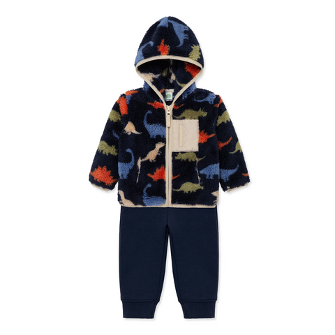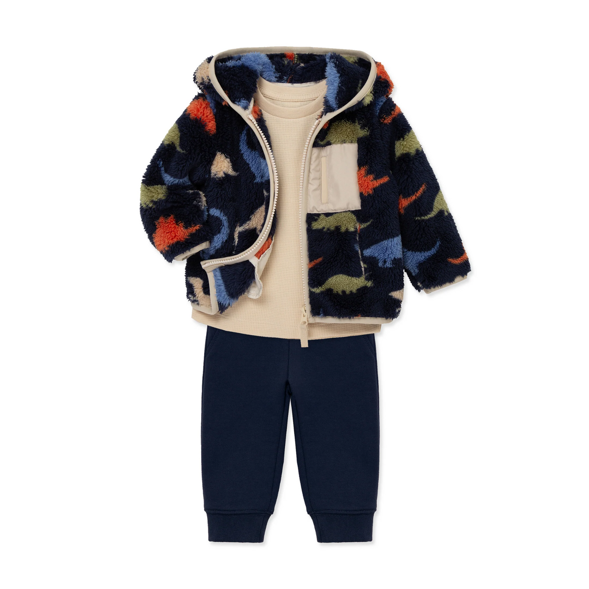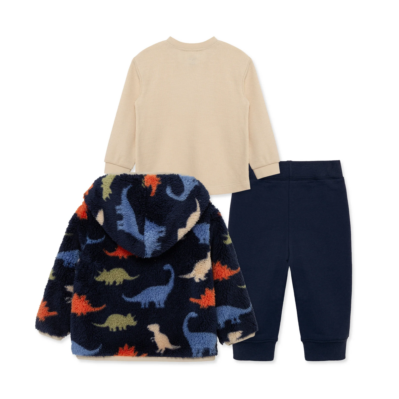 Layer up your little one in cozy style with this 3-piece Dino Sherpa Set. The soft sherpa zip-up hoodie features an allover dinosaur print with a warm hood and front pocket detail—perfect for chilly days. Paired with a neutral waffle-knit long-sleeve tee and comfy navy jogger pants, this set makes getting dressed easy and adorable.