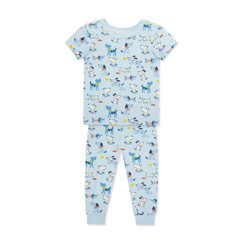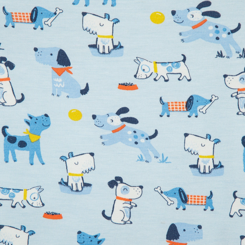 Dress your little one in comfort and style with our adorable baby boy pajama set featuring a delightful blue and white dog print. The short sleeve top and matching bottoms are crafted from a soft blend of 95% Viscose from Bamboo and 5% Spandex, ensuring a cozy fit that moves with your child. The light blue background showcases a playful all-over print of colorful puppies, making bedtime fun and exciting. With an easy slip-on design and an elastic waistband, these pajamas are perfect for hassle-free dressing and sweet dreams.