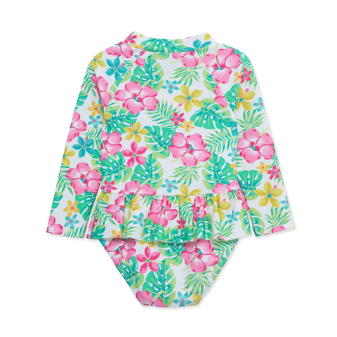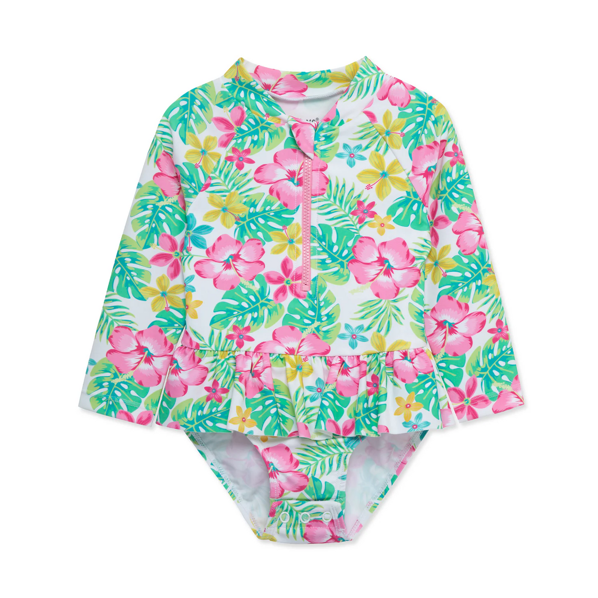 Shade your little beach baby from the sun with a girls' tropi-cool rashguard one-piece swimsuit crafted from protective UPF 50+ fabric!