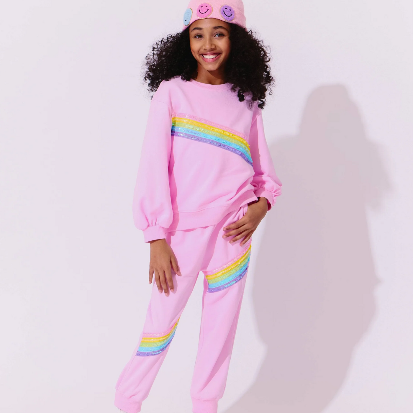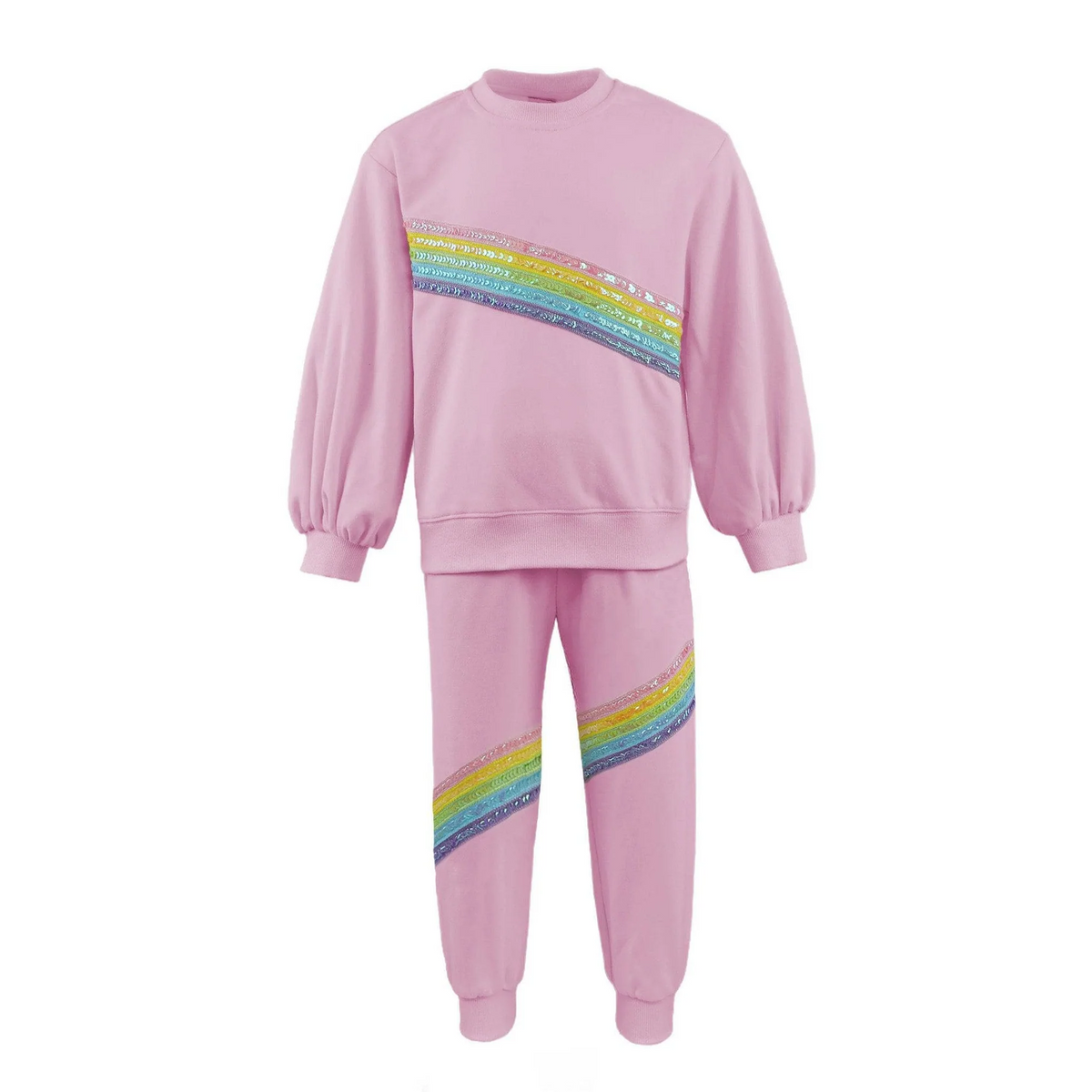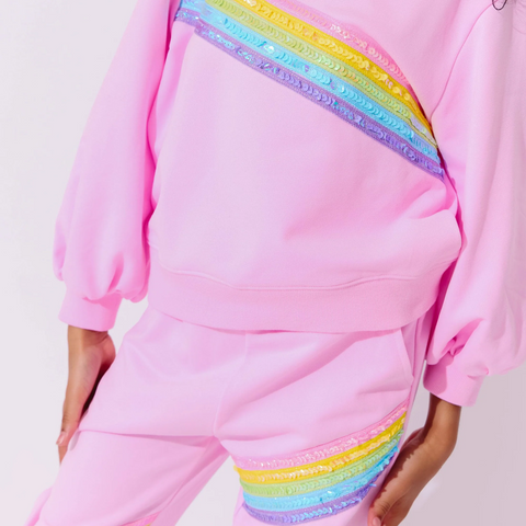 Bring a pop of color (and sparkle!) to her day with this playful two-piece set. The soft pink sweatshirt and matching joggers are accented with vibrant rainbow sequin stripes for a fun, feel-good look. Perfect for playdates, outings, or cozy days at home, this set combines comfort and style in one easy outfit.