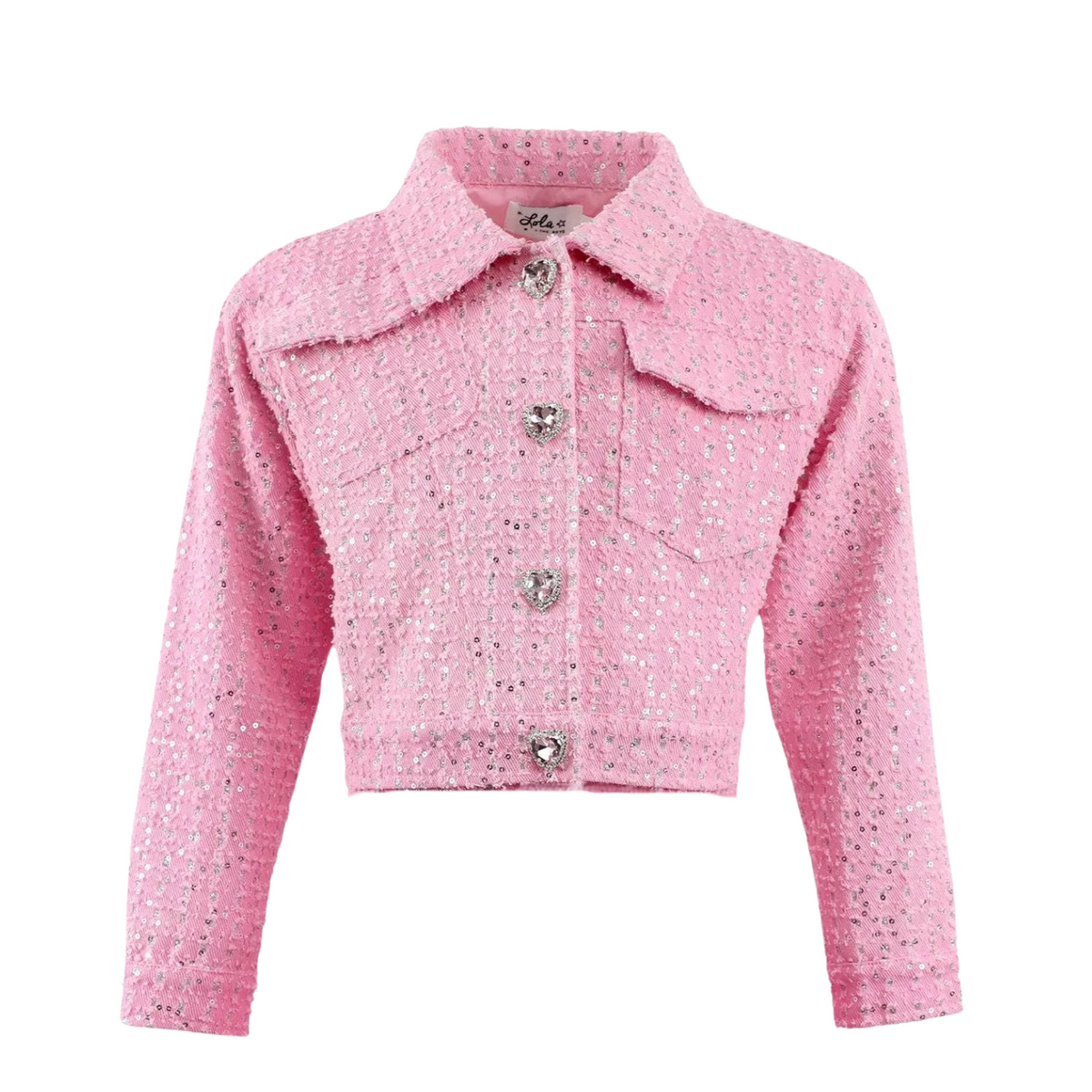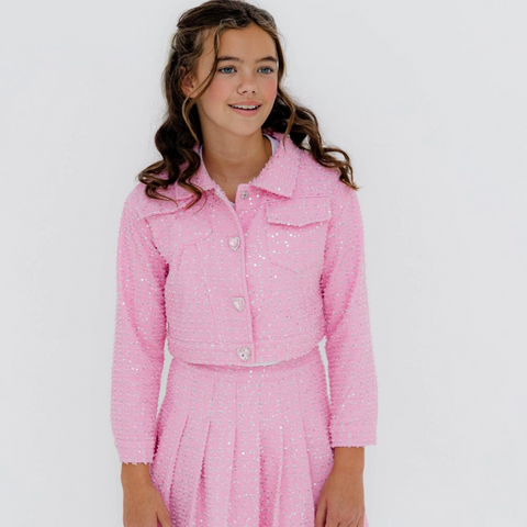 Your lil diva is destined to dazzle in our Rosie Shimmer Denim Jacket, made from a pink denim blend and complete with shimmering rhinestone accents, perfect for all-day sparkle. Heart-shaped crystal buttons add the perfect touch of charm, while the tailored cut keeps the look chic and flattering. Made to match our Rosie Shimmer Denim Skirt for a full glam look.
