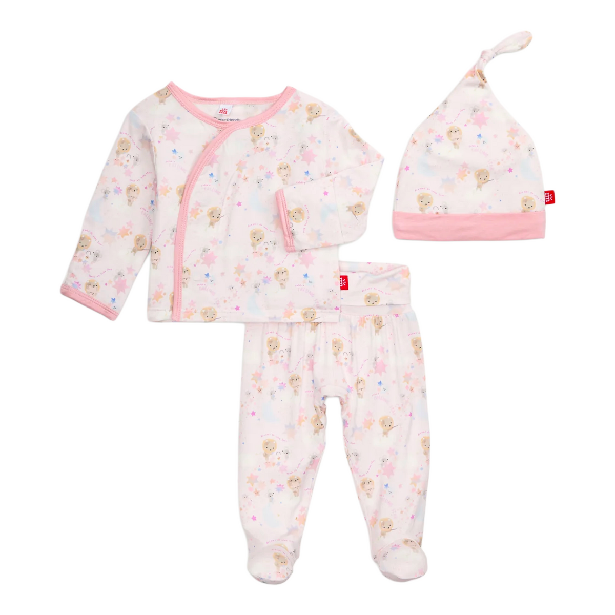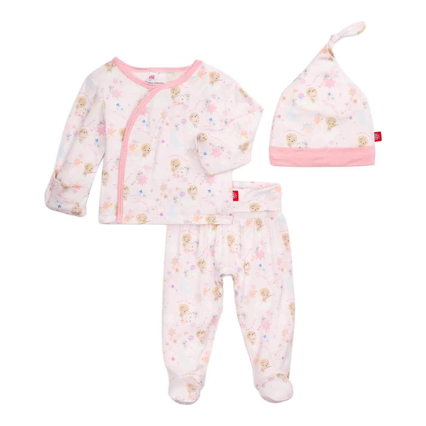 Welcome your little one in the sweetest way with our silky-soft Take Me Home Set. Made from sustainable TENCEL™ modal, this newborn essential is breathable, gentle on delicate skin, and designed for all-day, all-season comfort. The wrap-style kimono top features hidden magnetic closures for stress-free dressing, while the footed pants and matching hat keep baby cozy from head to toe. Built-in mitten cuffs help prevent scratches, making this set as practical as it is adorable.