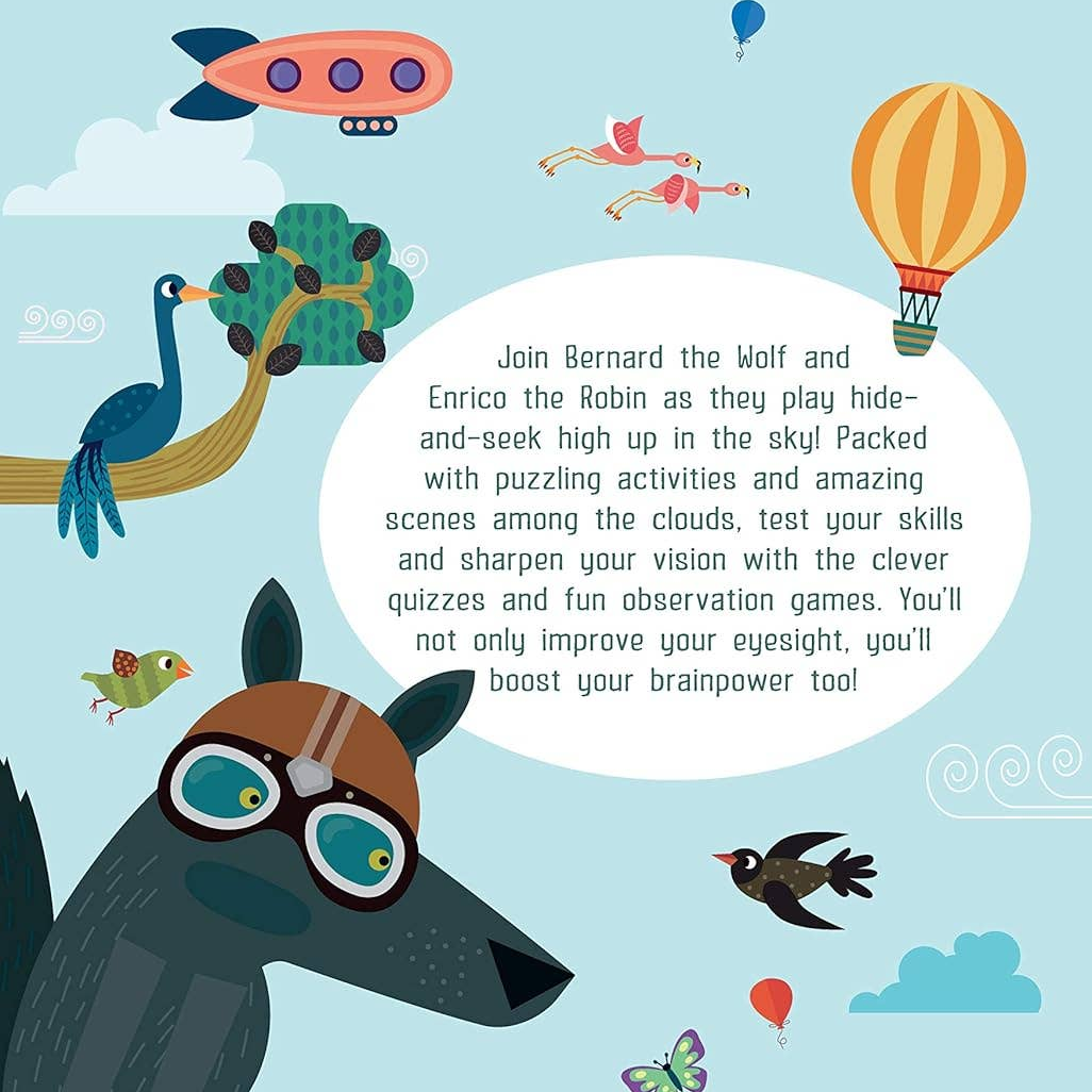 Bernard the Wolf is back in another thrilling seek-and-find adventure! This time, he's flying high up in the sky with the help of his new friend, Enrico the Robin, who's teaching him how to sharpen his vision. Filled with charming visual puzzles that take place in outer space, among colorful hot air balloons, inside a flock of flamingos, and more, children will have tons of fun while they develop their observation skills and practice drawing conclusions based on what they see with more than 100 hidden object games! From determining which bird is pretending to be a wizard and which alien has a cold to what seems out of place and who is the lazy acrobat, Find Me! Adventures in the Sky is sure to entertain for hours on end!