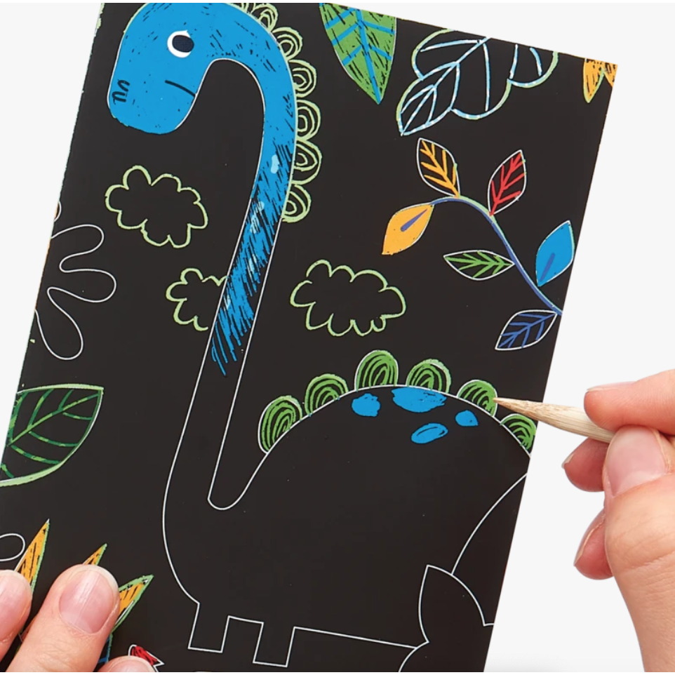 Delightful dinosaurs in rainbow hues are hidden until you scratch and scribble to reveal them. Mini but mighty, this kids scratch art kit has everything included for dinosaur fun. This dinosaur themed scratch art kit is perfect for travel sized fun for on-the-go, or at home creativity.