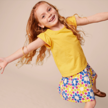 Our best selling Sport Skort is a skirt on the outside and Somersault Shorts on the inside--made for carefree play day after spring day. The gorgeous, multi-colored stripe print will hold its color wash after wash. 100% soft cotton. Above thigh length.